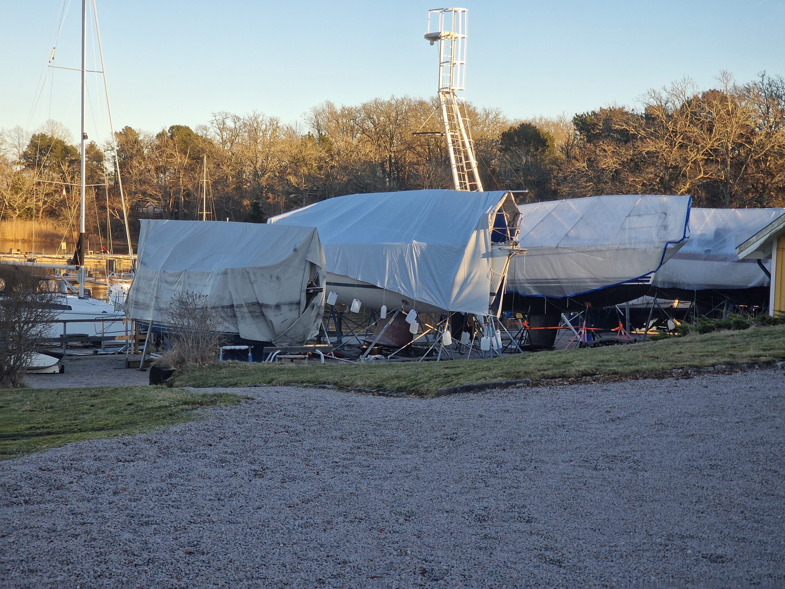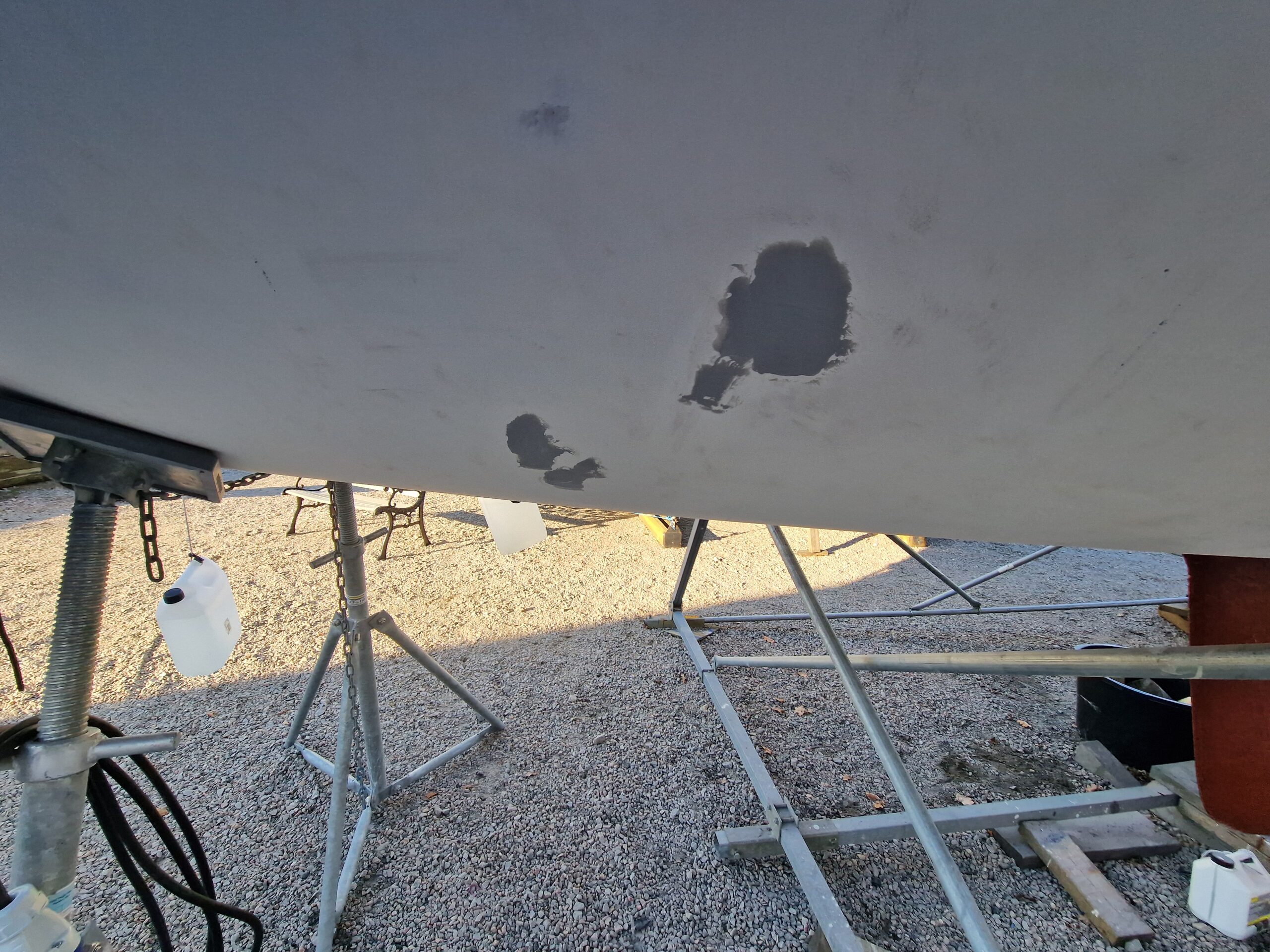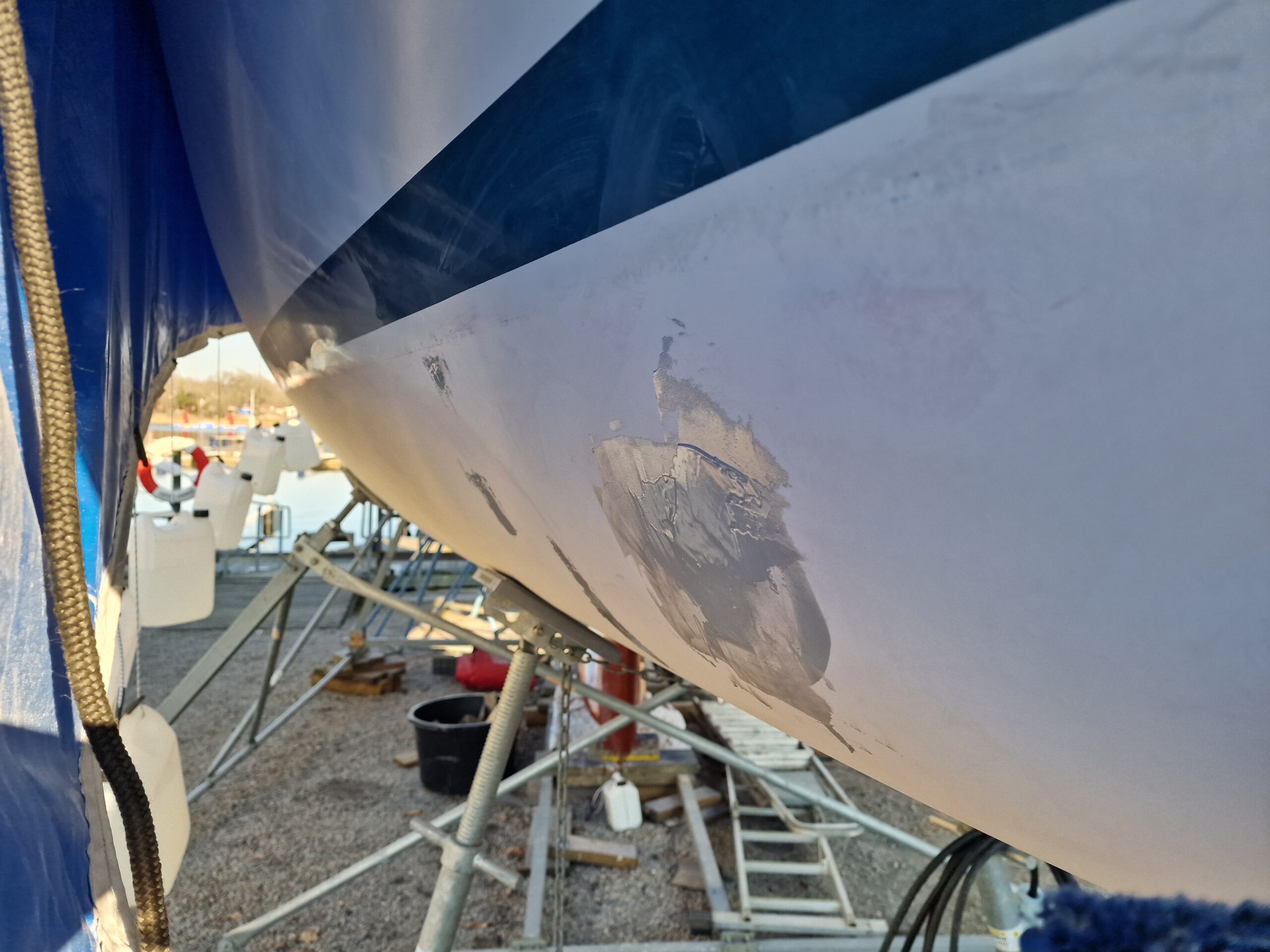 Under dagen fokuserade vi på att epoxispackla några mindre lagningar. Den största lagningen krävde lite extra hjälp, så vi lånade en infravärmare av Nicklas i Karlskrona för att få upp härdningstakten. Temperaturen låg runt 9 grader under dagen och sjönk till ungefär 8 grader framåt 17 när vi packade ihop. Inte direkt sommarvärme, men ändå hanterbart.