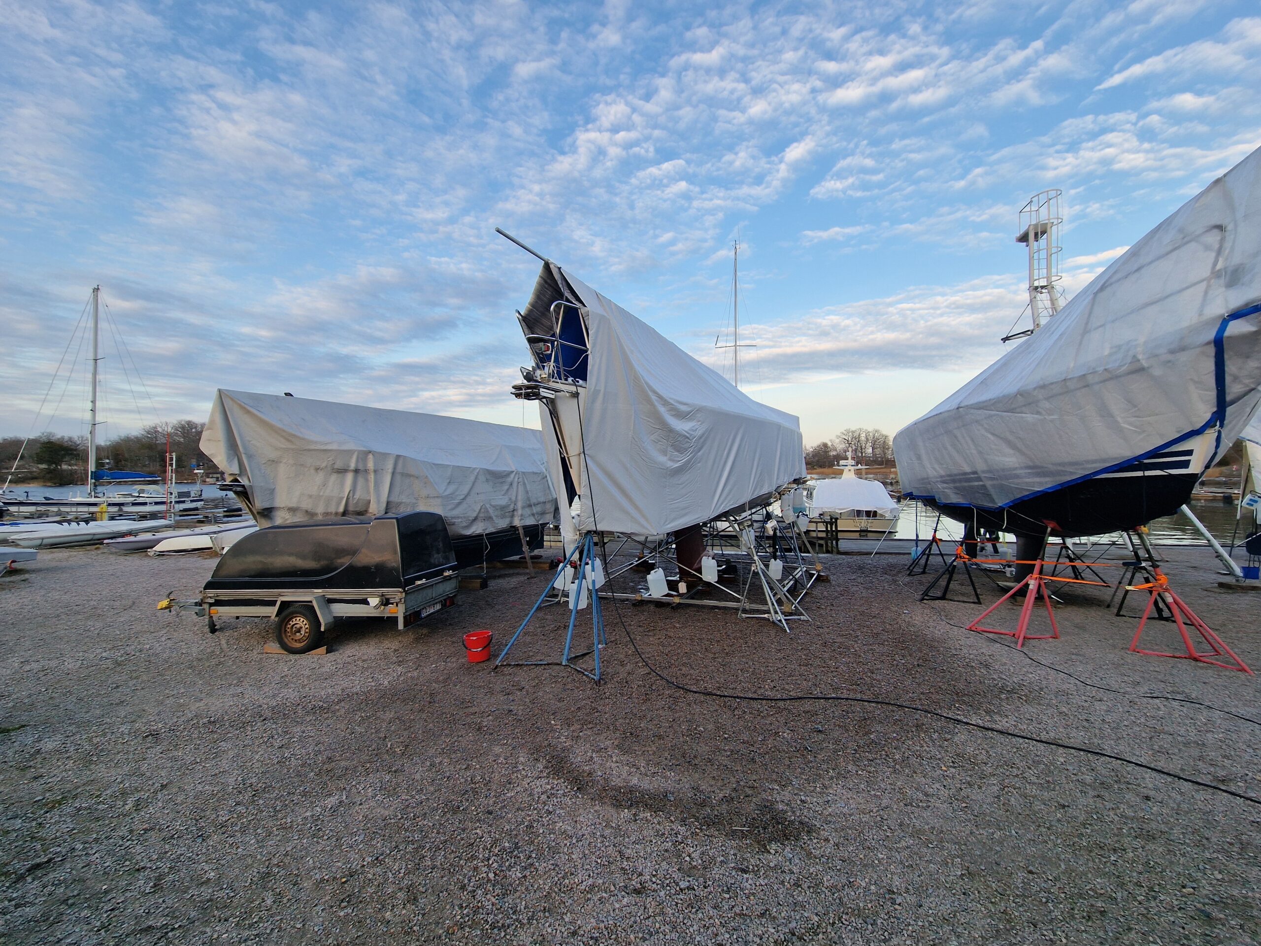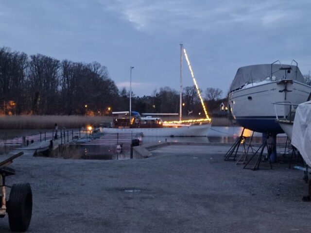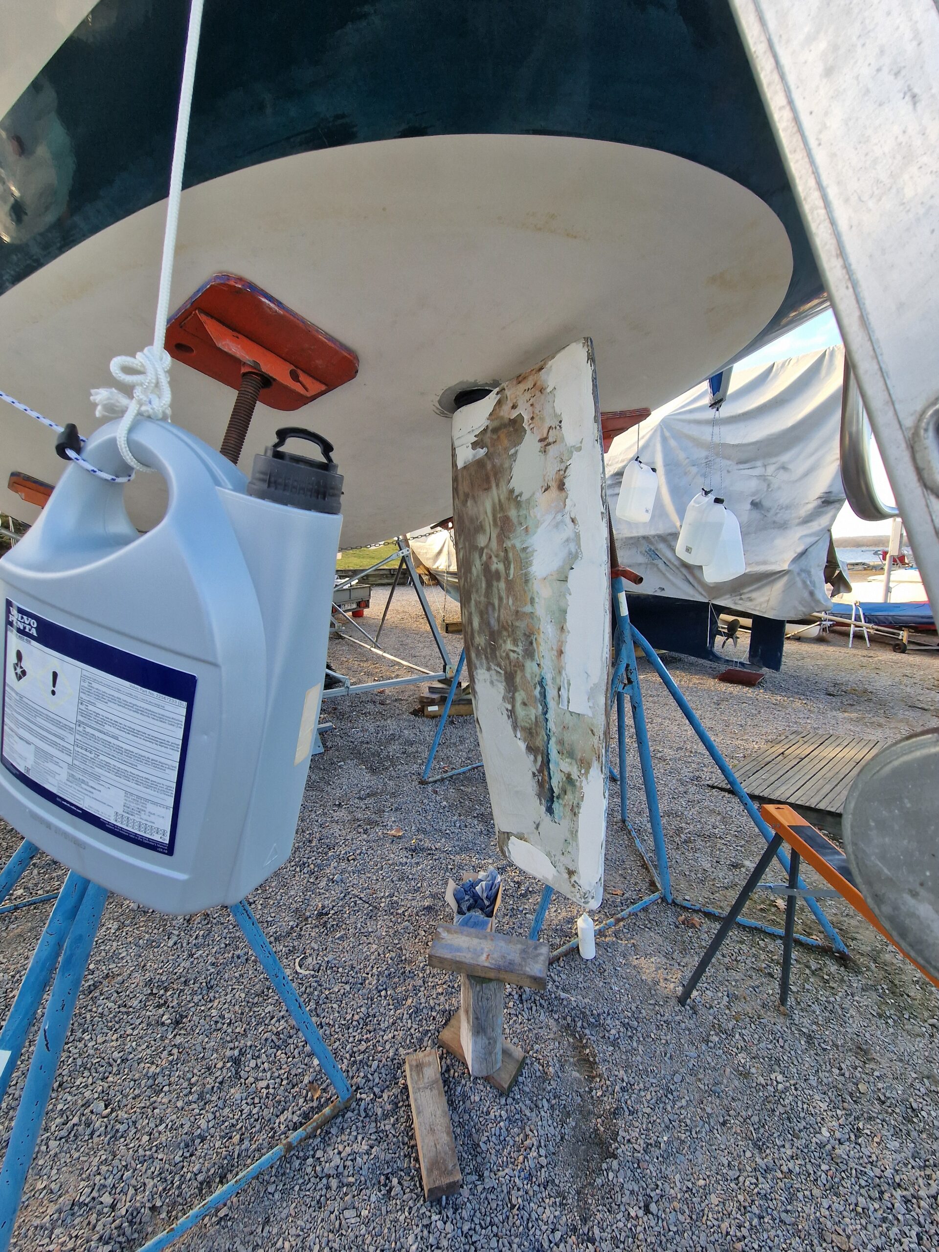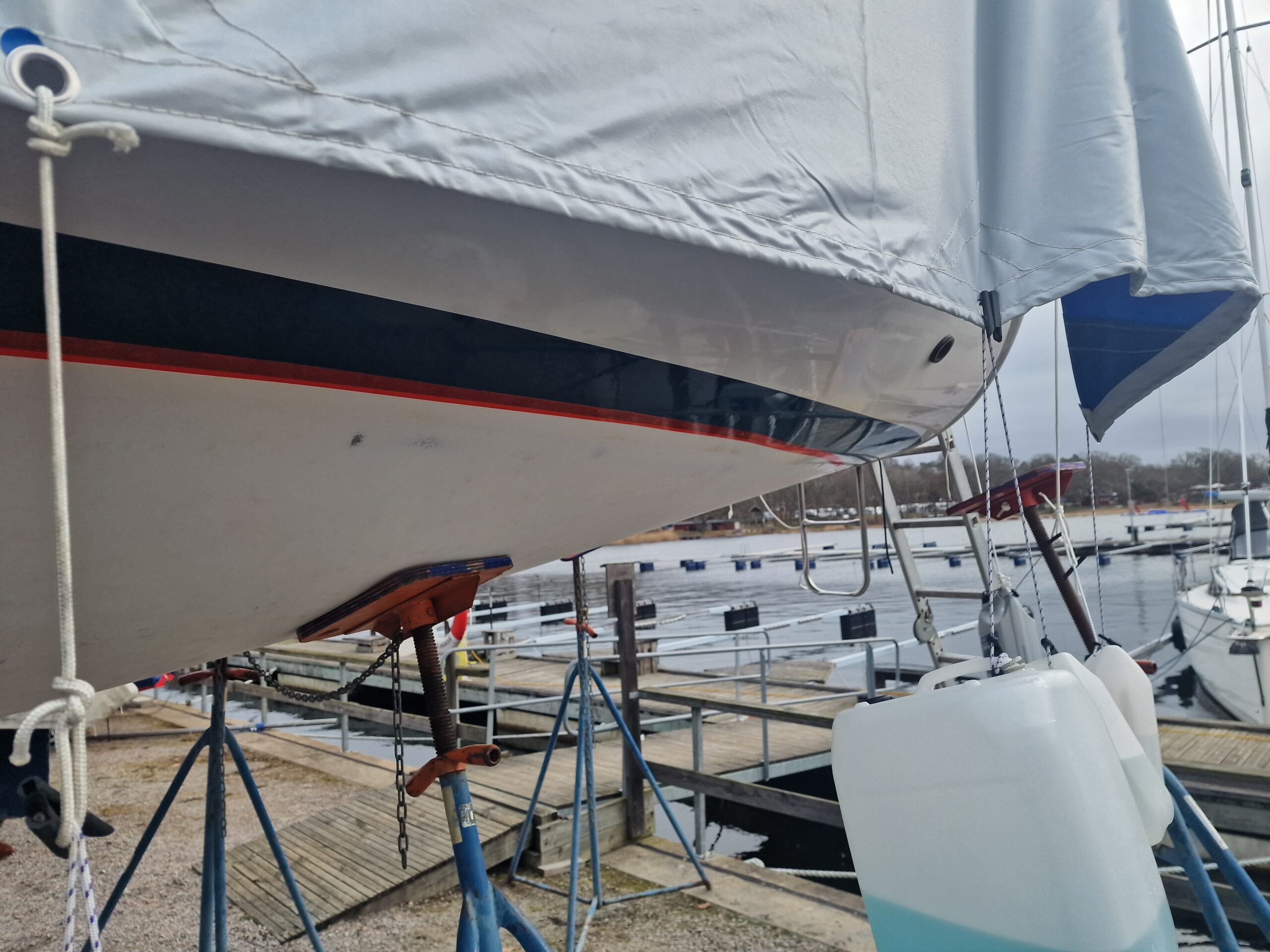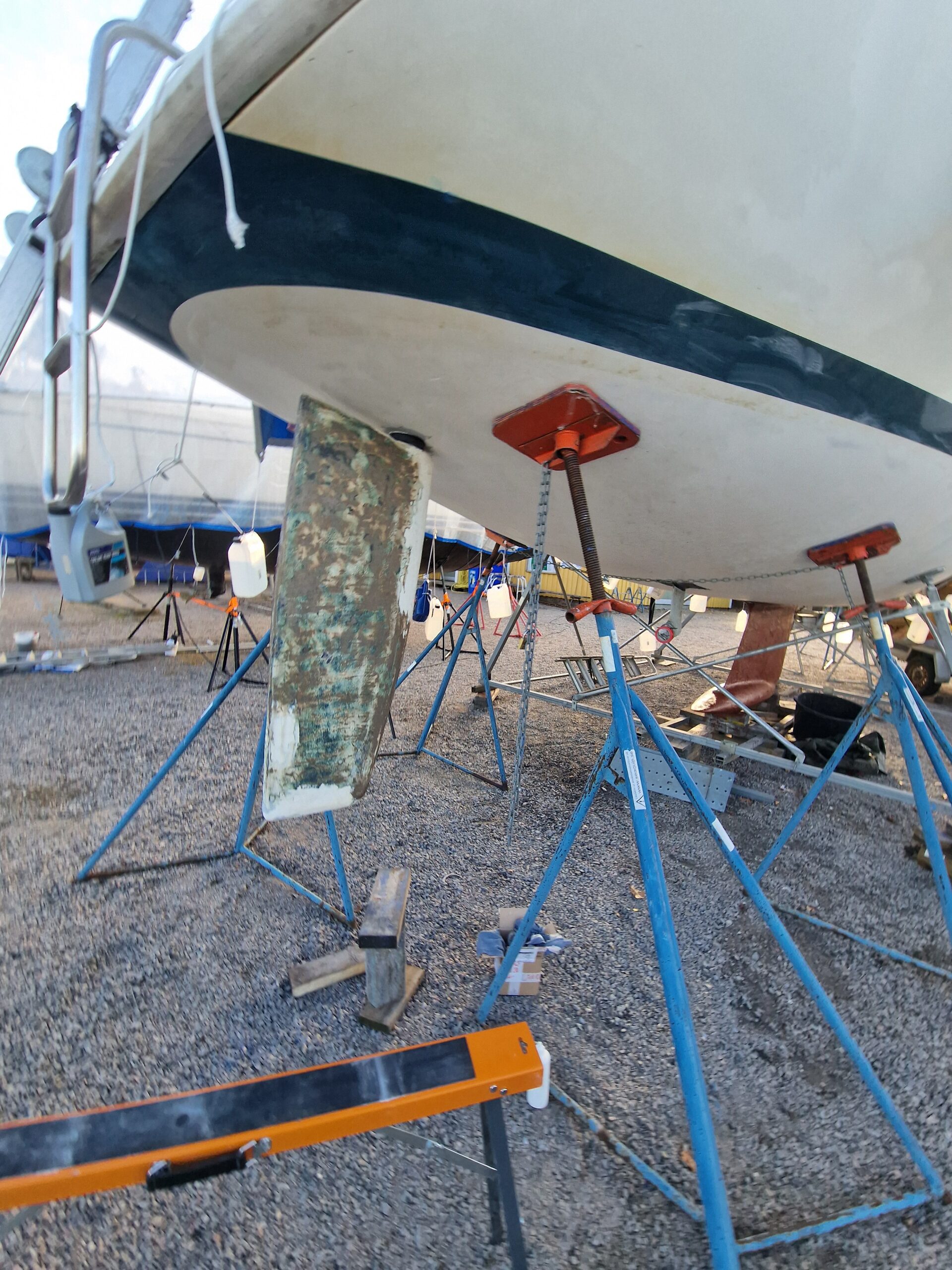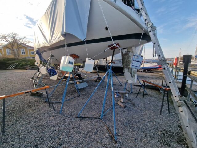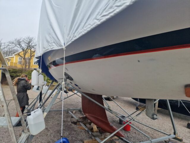 När vi kom fram till Sommarro tvättade vi av skrovet och testade att montera rodret tillsammans med de nya roderlagren. Detta gjorde vi innan vi planerar att epoxa fast lagerhylsorna från Jefa. Det kändes väldigt lovande – inget märkbart glapp alls, trots att vi ännu inte dragit centrummuttern helt. Vi passade även på att väga rodret, som landade på 38,5 kg, vilket ligger helt inom det normala spannet för Sommarro.