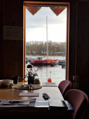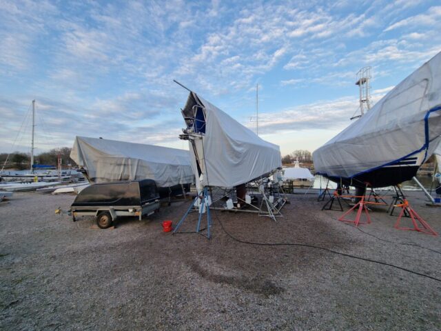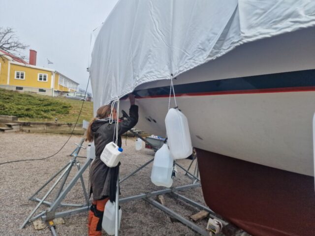 Idag gick vi upp redan vid sju och började med en kopp kaffe innan vi satte igång med att tejpa den nya vattenlinjen, som höjs med 3,5 cm – ett förebyggande steg inför längre eskapader med Sommarro.