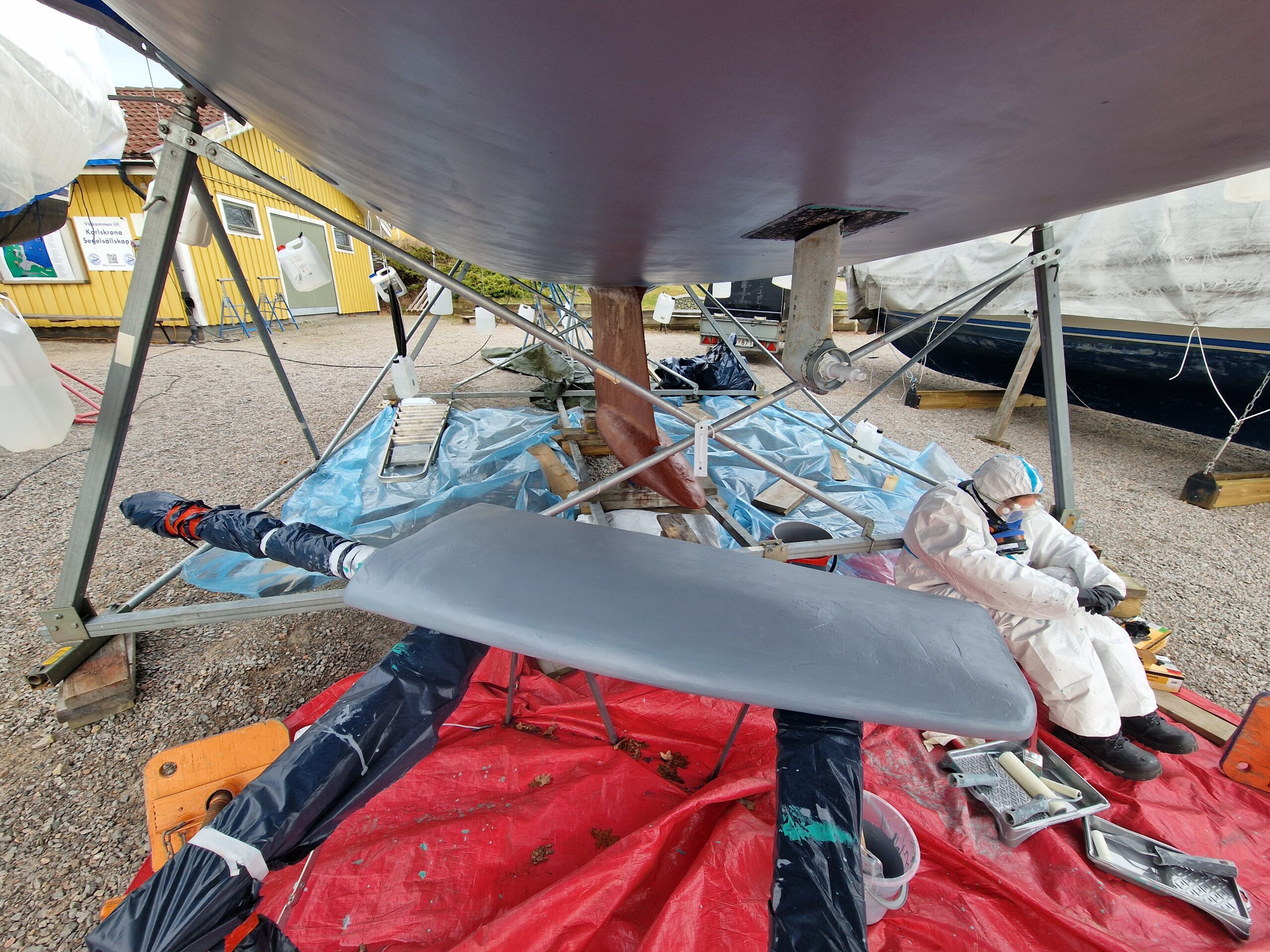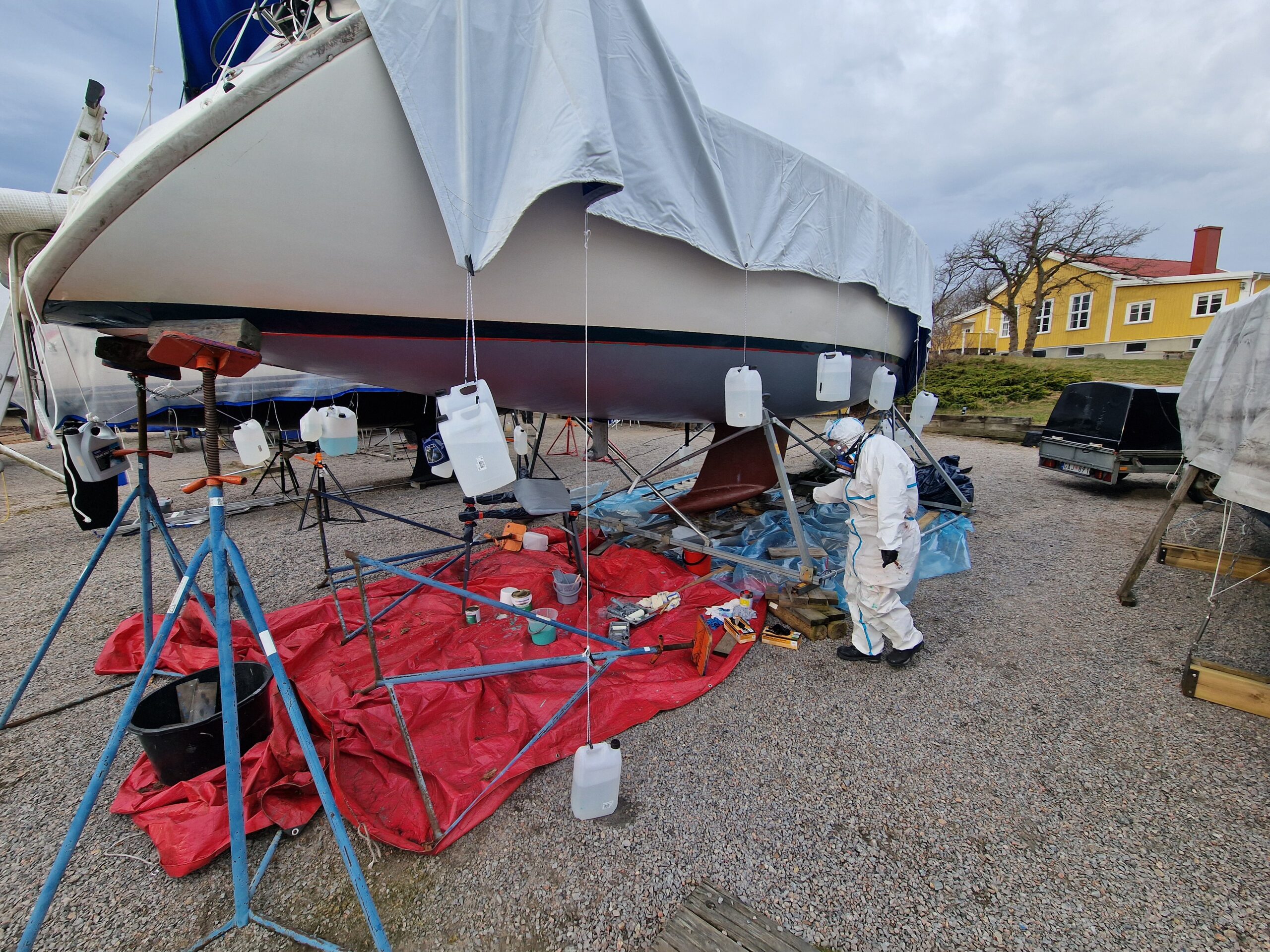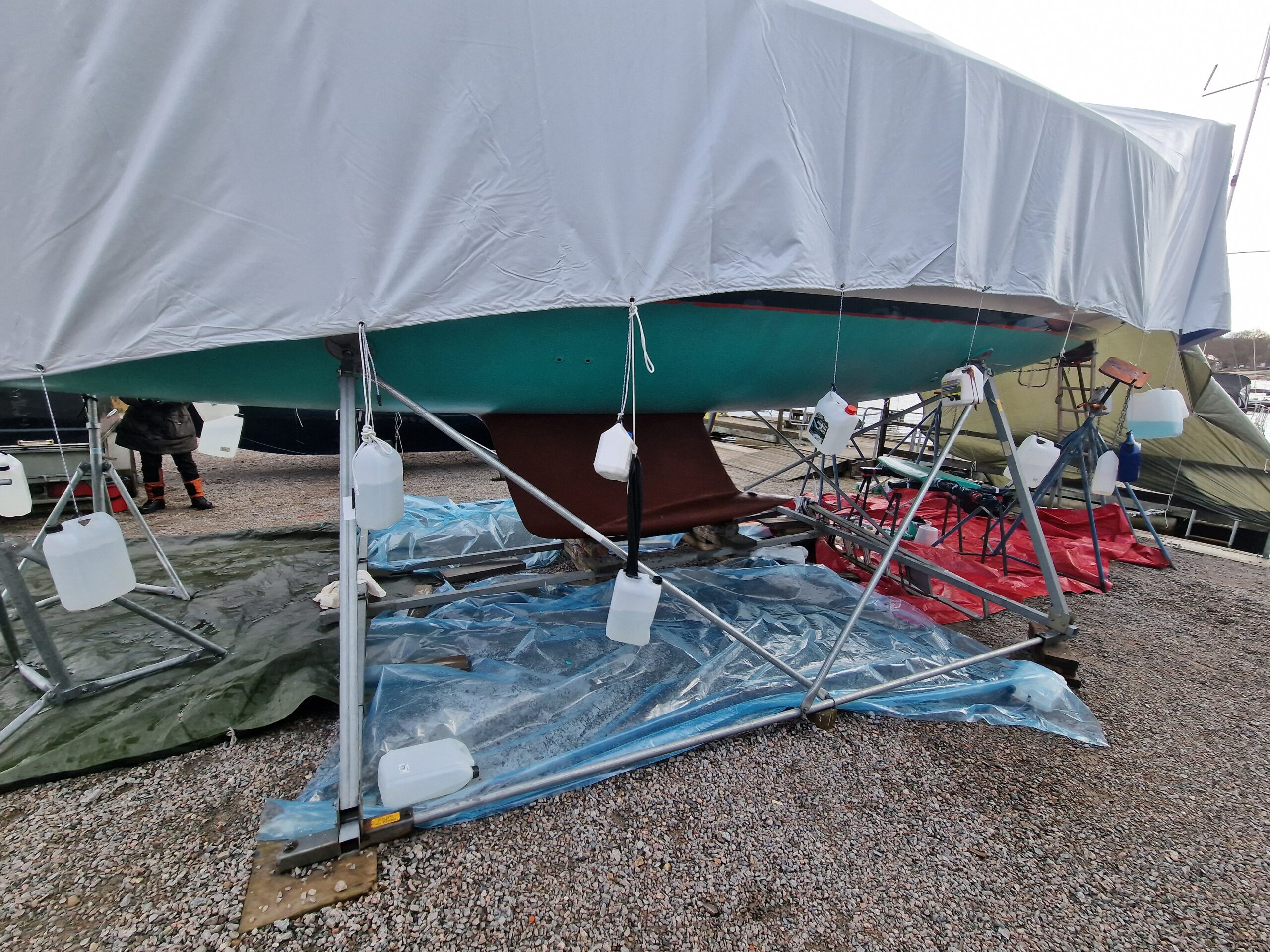 Under tiden mellan strykningarna försökte vi sätta upp presenningar runt Sommarro för att kunna använda byggfläktar under båten och på så sätt påskynda härdningen av epoxifärgen. Det visade sig dock vara i princip omöjligt. En nordvästlig vind låg rakt på, och vid utläggan nådde byarna upp mot 23 m/s. En stor Jonsered-presenning fungerade mer som ett segel än som skydd, och vi fick ge upp försöken att täcka in båten.