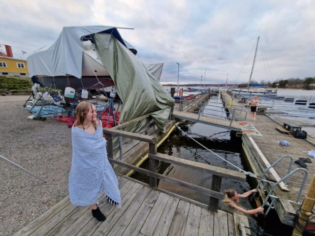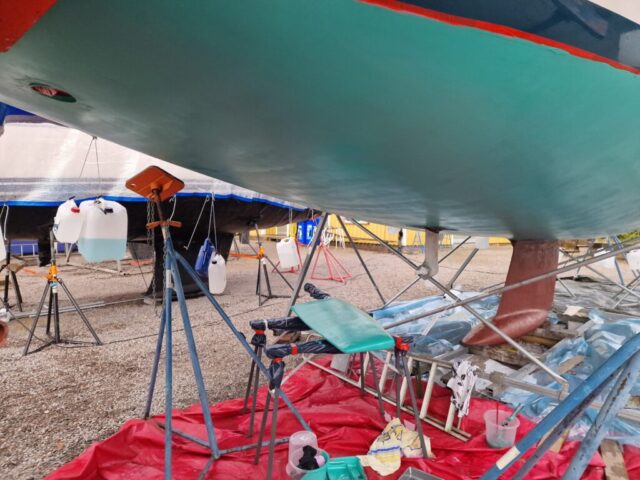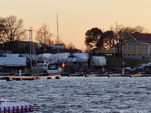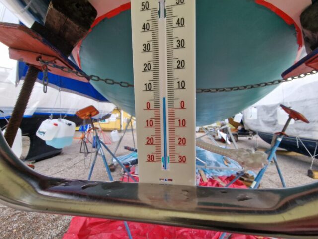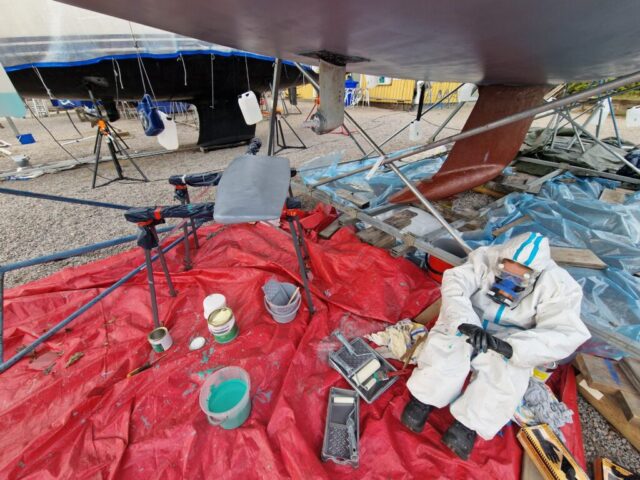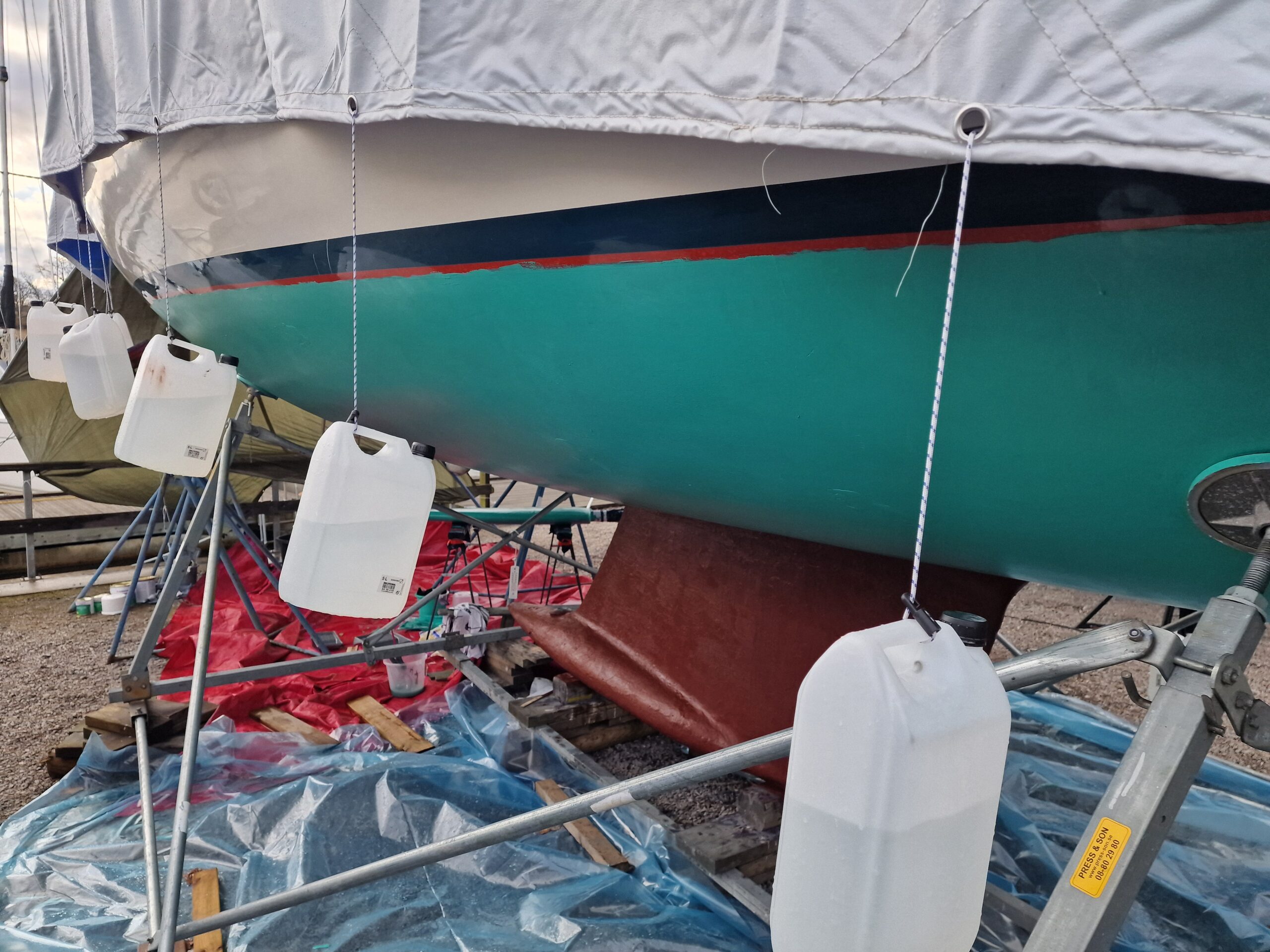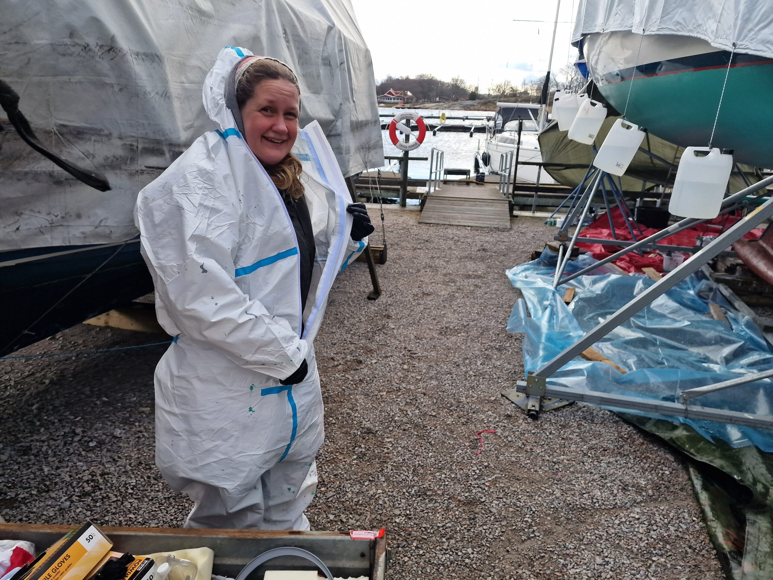 Under tiden mellan strykningarna försökte vi sätta upp presenningar runt Sommarro för att kunna använda byggfläktar under båten och på så sätt påskynda härdningen av epoxifärgen. Det visade sig dock vara i princip omöjligt. En nordvästlig vind låg rakt på, och vid utläggan nådde byarna upp mot 23 m/s. En stor Jonsered-presenning fungerade mer som ett segel än som skydd, och vi fick ge upp försöken att täcka in båten.