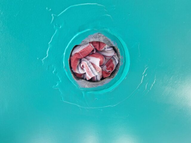 Efter att färgen blandats lät vi den stå i cirka 10 minuter innan vi började måla, så att eventuell luft skulle hinna försvinna – precis enligt specifikationen från AkzoNobel International Gelshield.