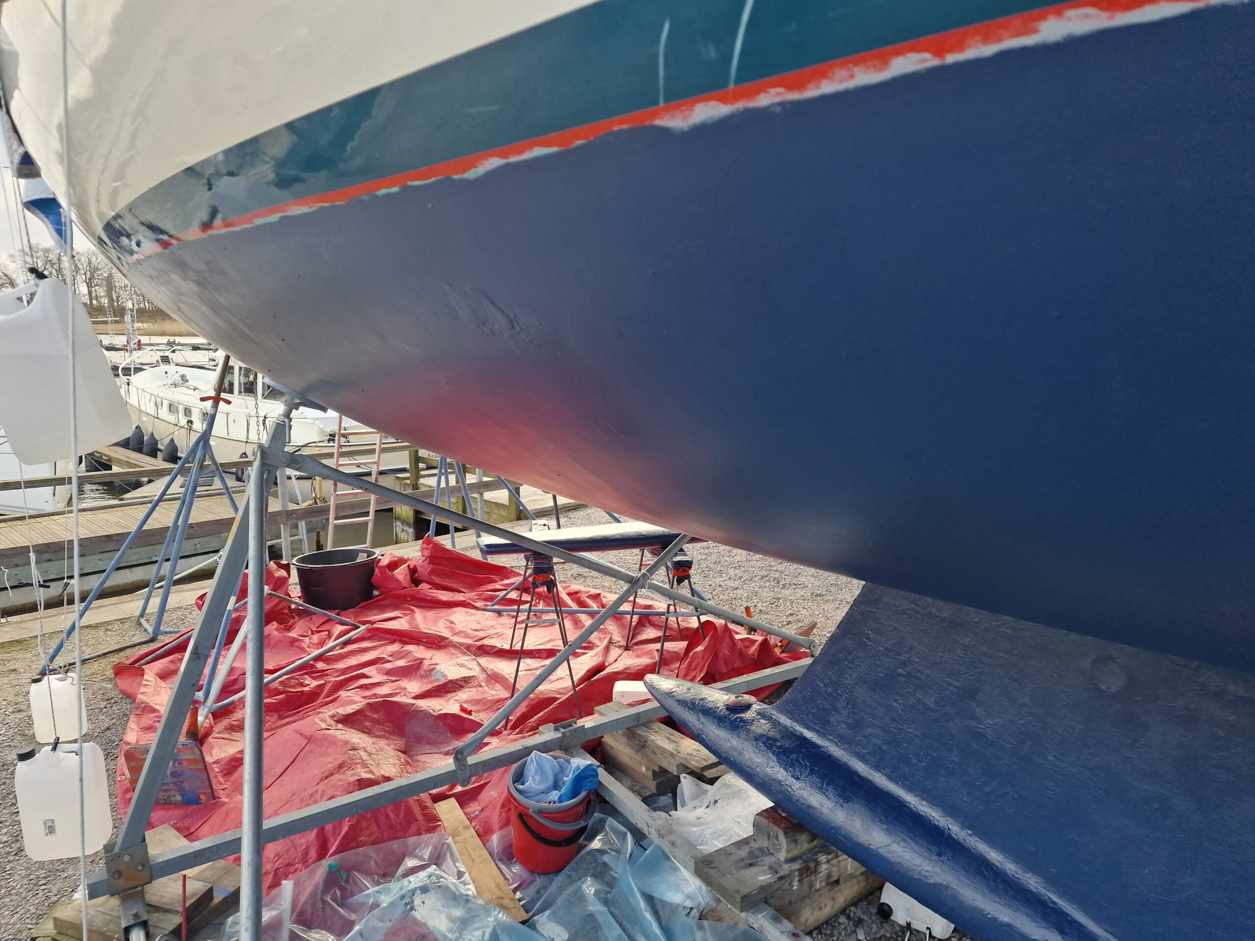 Tidigt på måndagsmorgonen, vid sjutiden, var det dags att lägga på första lagret bottenfärg. Enligt specifikationen behövde den appliceras inom 16 timmar efter epoxybehandlingen, så det var bara att köra på. Det andra och sista lagret bottenfärg planerar vi att stryka på nästa helg.