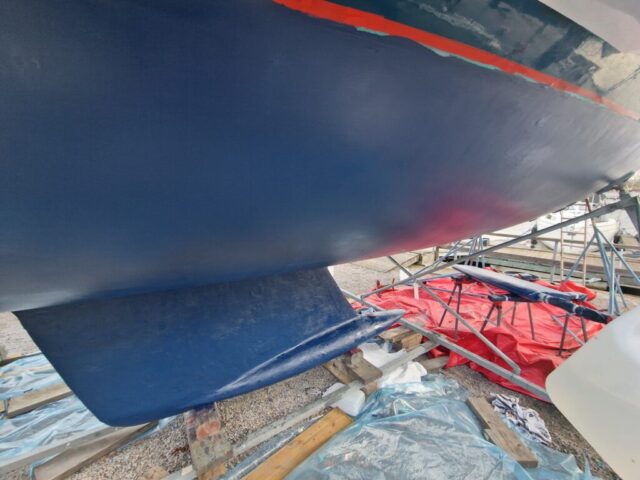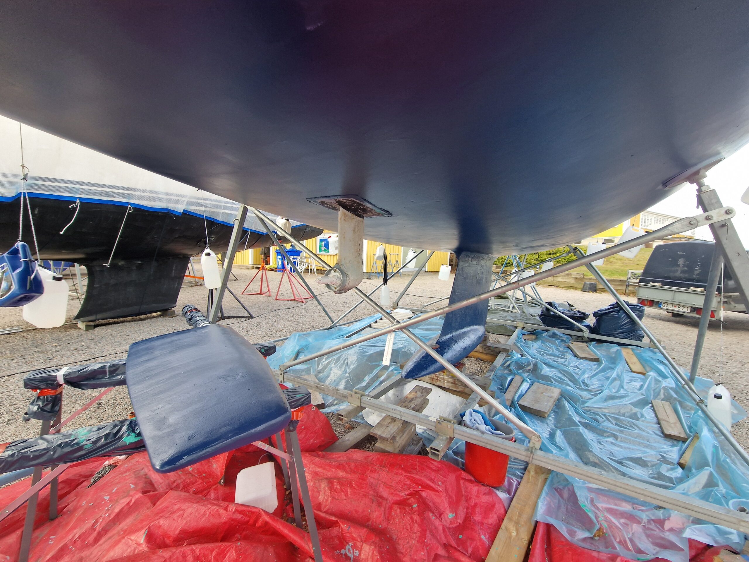 Resten av söndagen gick åt till att slipa och epoxyspackla inför montering av en ny inspektionslucka i aluminium från Jefa. Den ska både ge bättre åtkomst och skydda lagret samt centrummuttern till roderstocken.