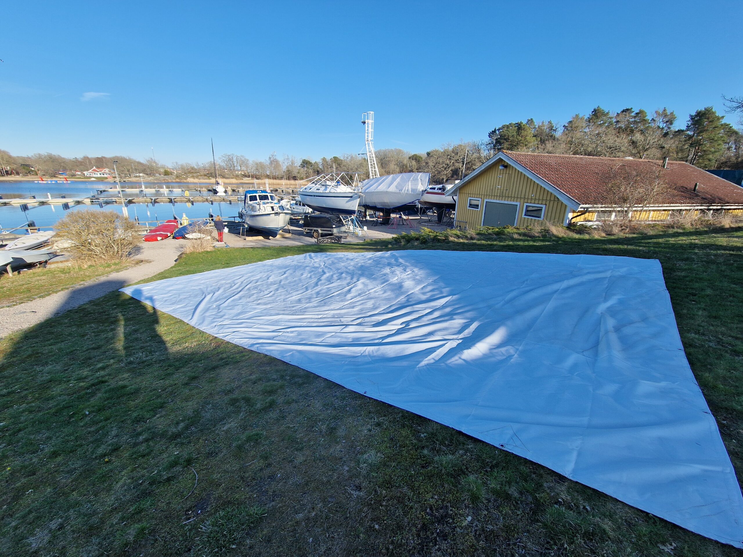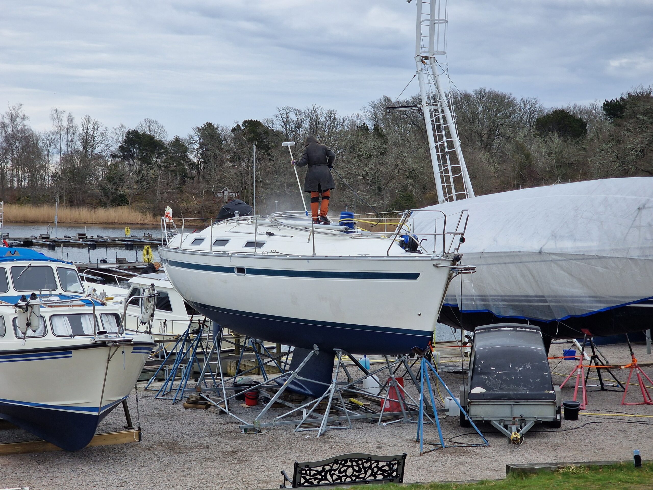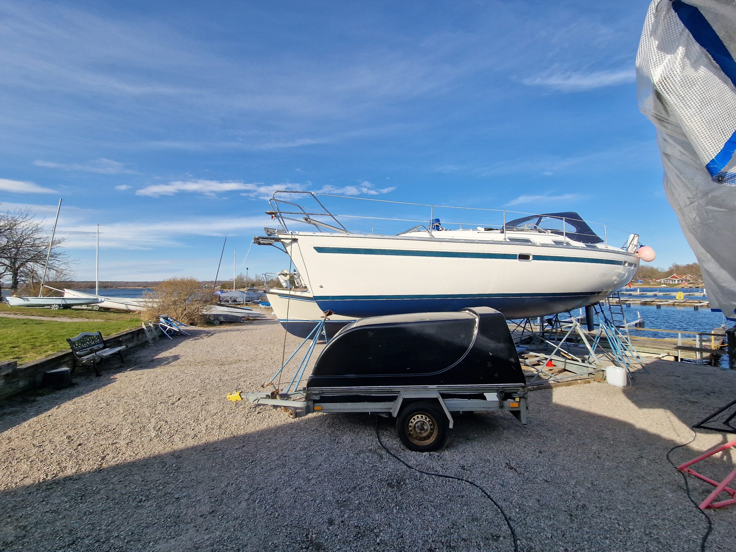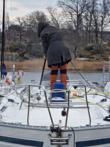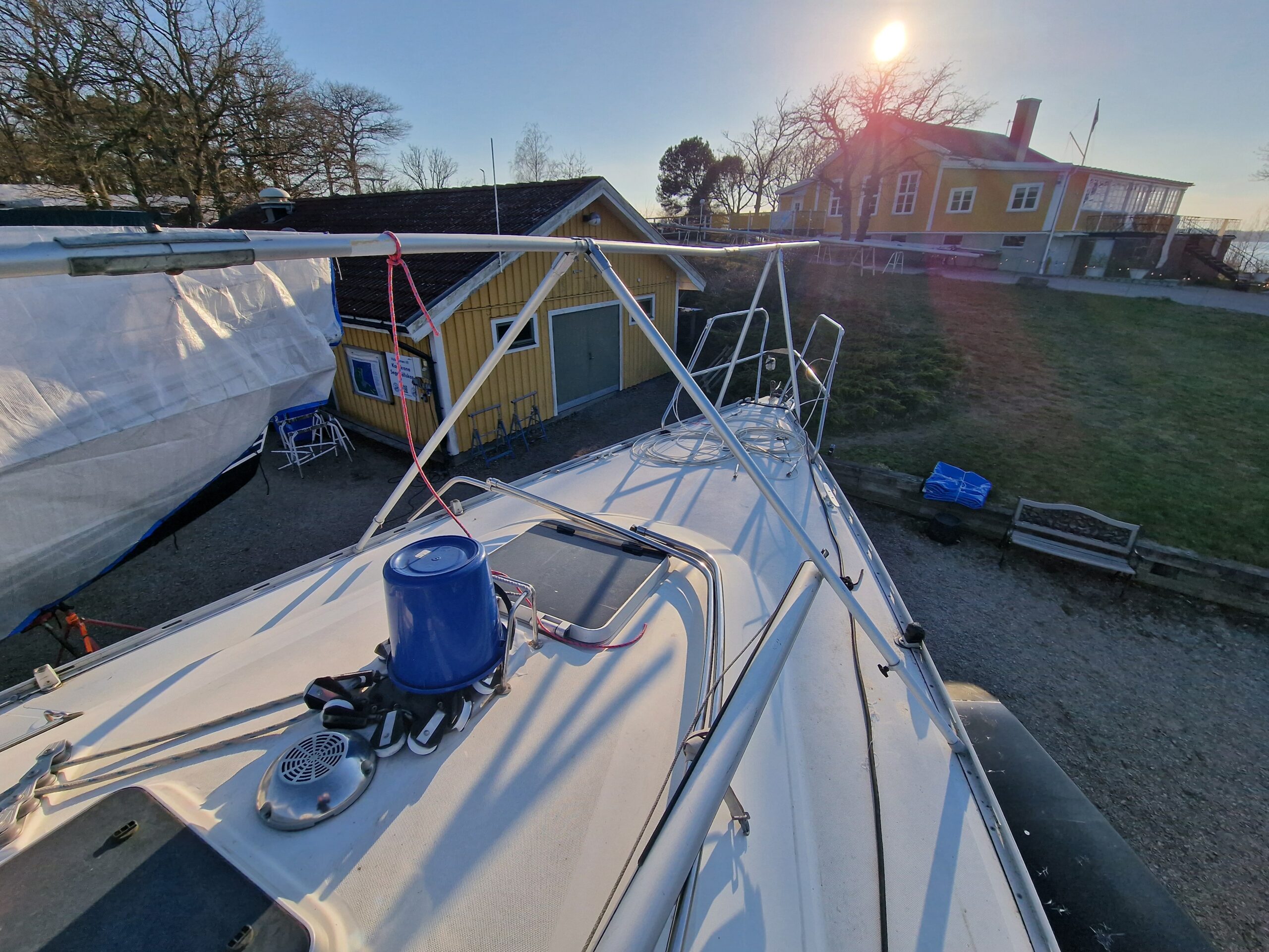 När färgen var lagd gick jag över till nästa projekt: täckställningen. Presenningen åkte ner och ställningen skruvades isär. Det blev en hel del plock och städning runt båten – rester från vintern och målningen skulle bort. Dunkarna som fått agera tyngder hade gjort sitt; flera hade spruckit i kylan. Till nästa vinter blir det en stabilare lösning med plintar och reglar, precis som de flesta andra verkar ha gått över till i hamnen.