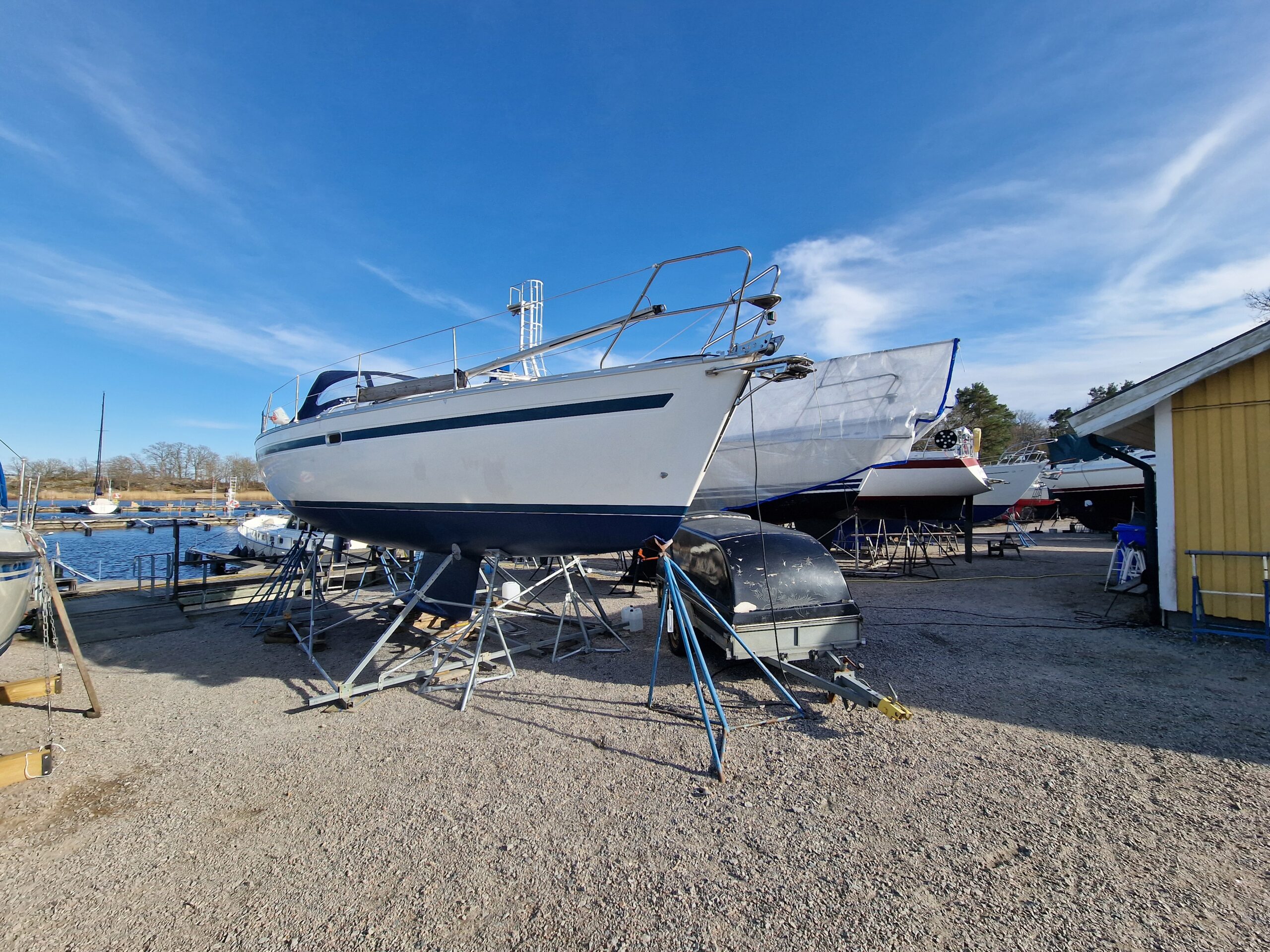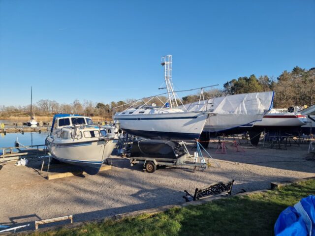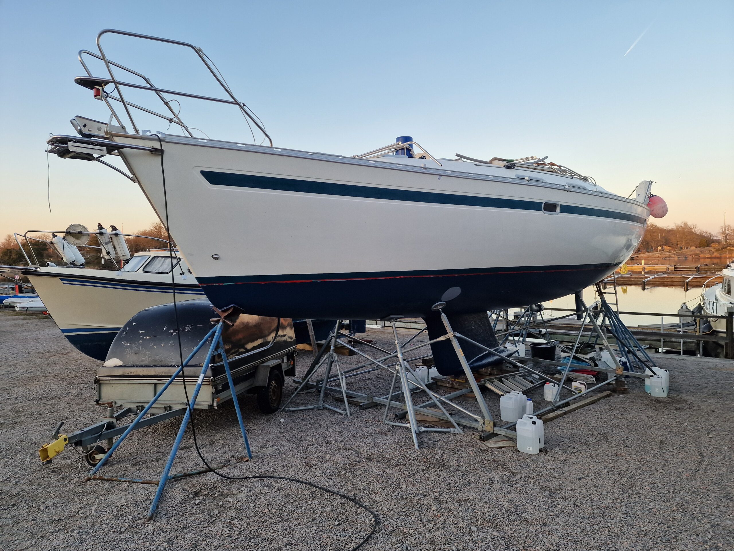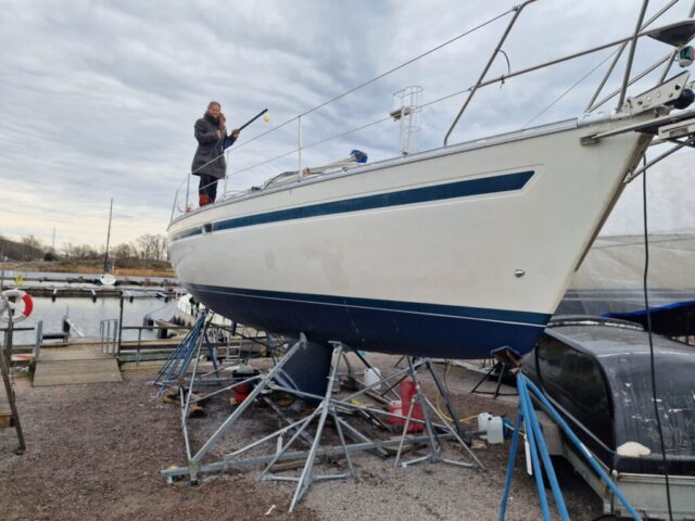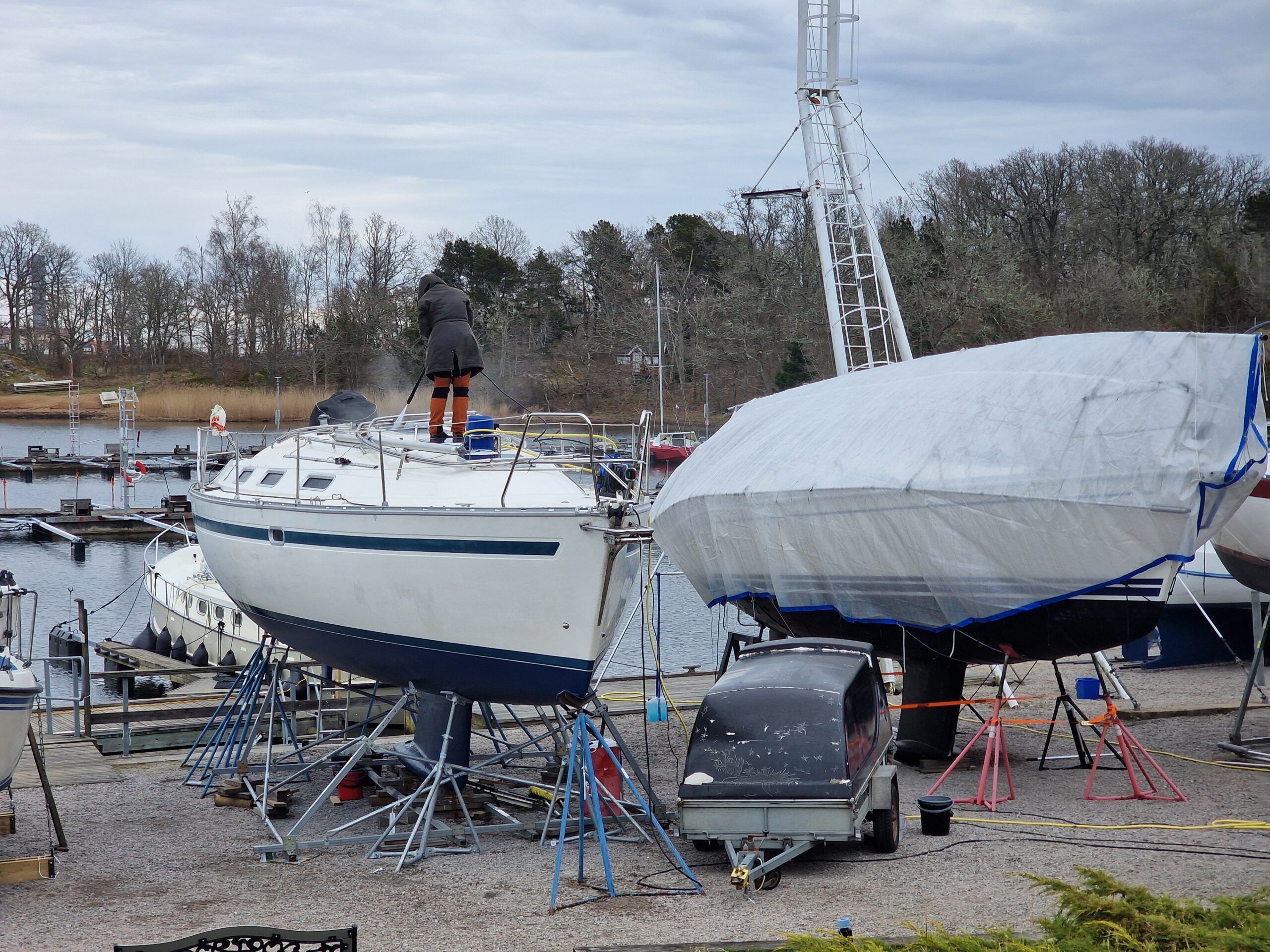 När färgen var lagd gick jag över till nästa projekt: täckställningen. Presenningen åkte ner och ställningen skruvades isär. Det blev en hel del plock och städning runt båten – rester från vintern och målningen skulle bort. Dunkarna som fått agera tyngder hade gjort sitt; flera hade spruckit i kylan. Till nästa vinter blir det en stabilare lösning med plintar och reglar, precis som de flesta andra verkar ha gått över till i hamnen.