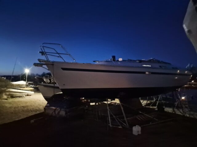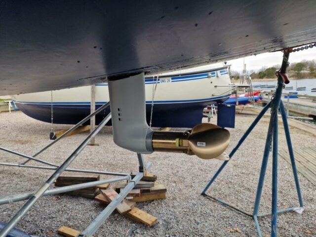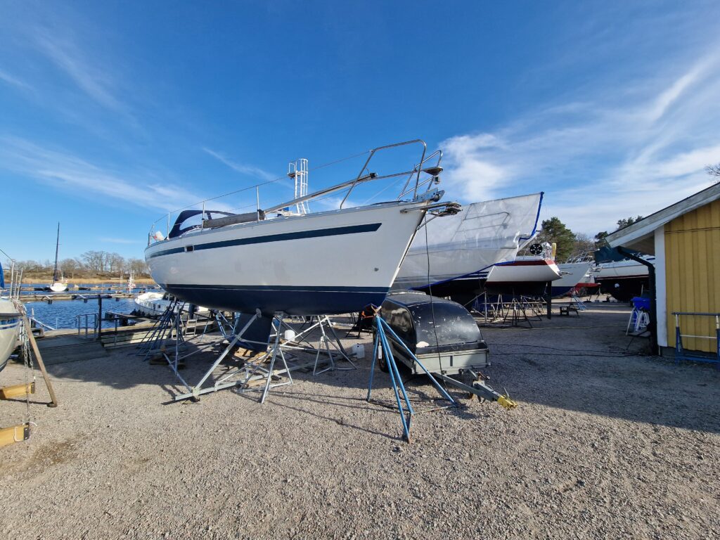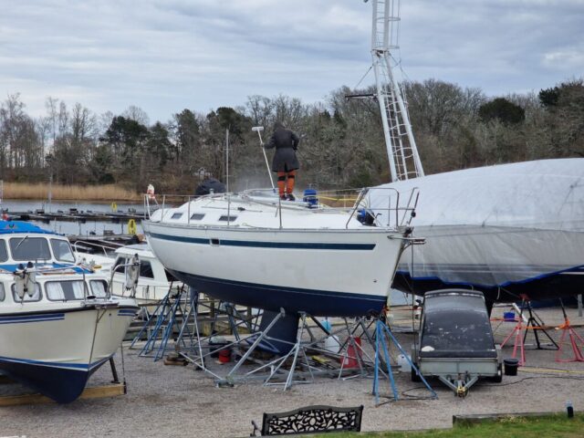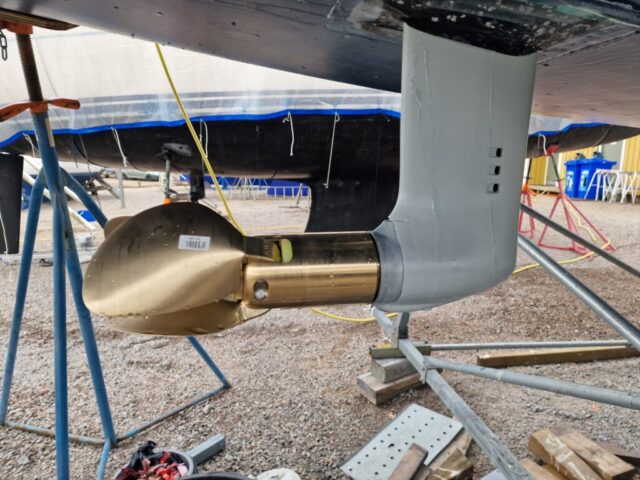 Väl framme bytte jag snabbt om och satte igång. Fjärde lagret epoxy skulle på, just där vaggan haft sina anläggningsytor. Samtidigt fick drevet lite kärlek – slipning först, sedan första lagret med Trilux. Det är något speciellt när man står där och jobbar metodiskt, lager för lager, och vet att varje moment tar båten ett steg närmare sjösättning.