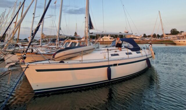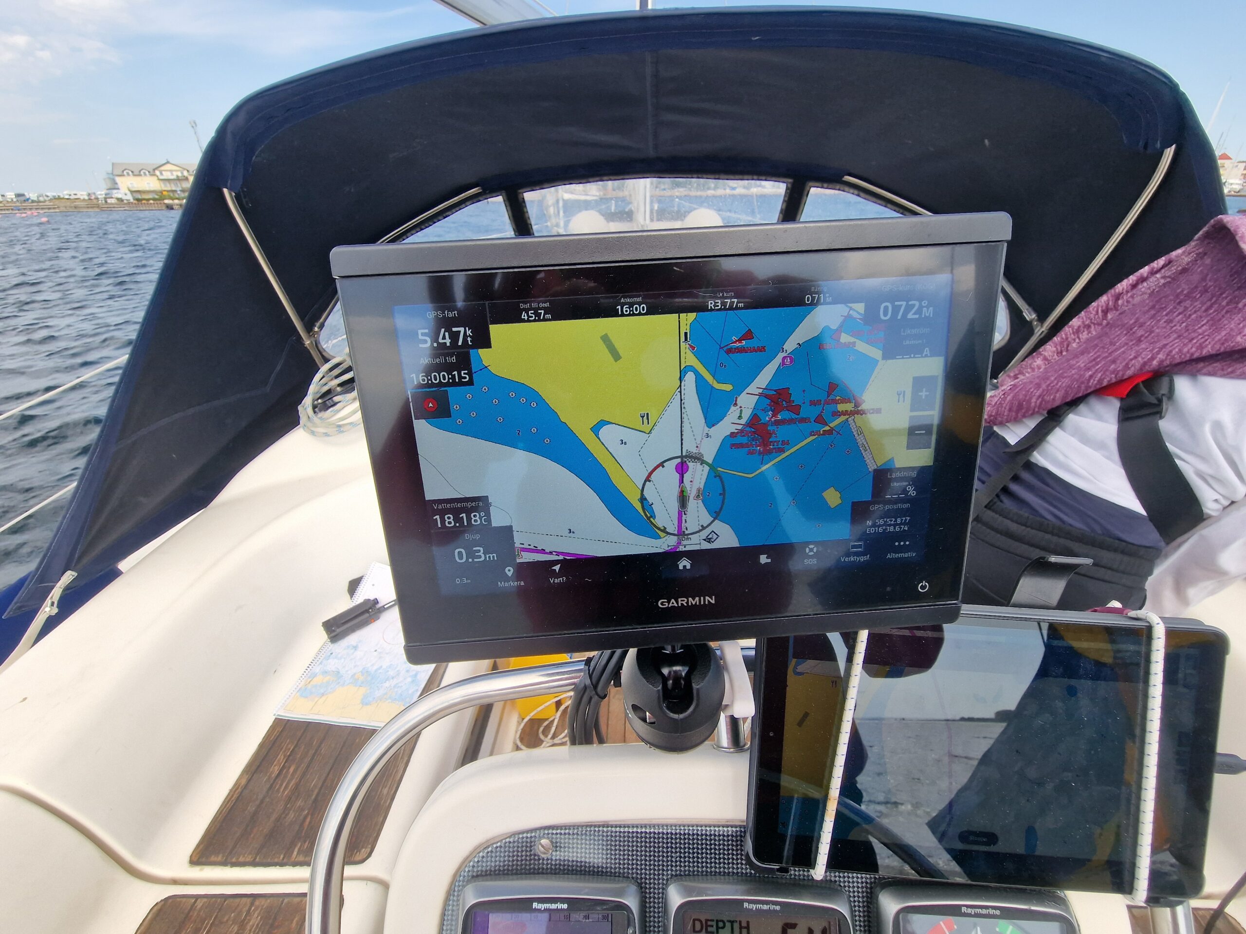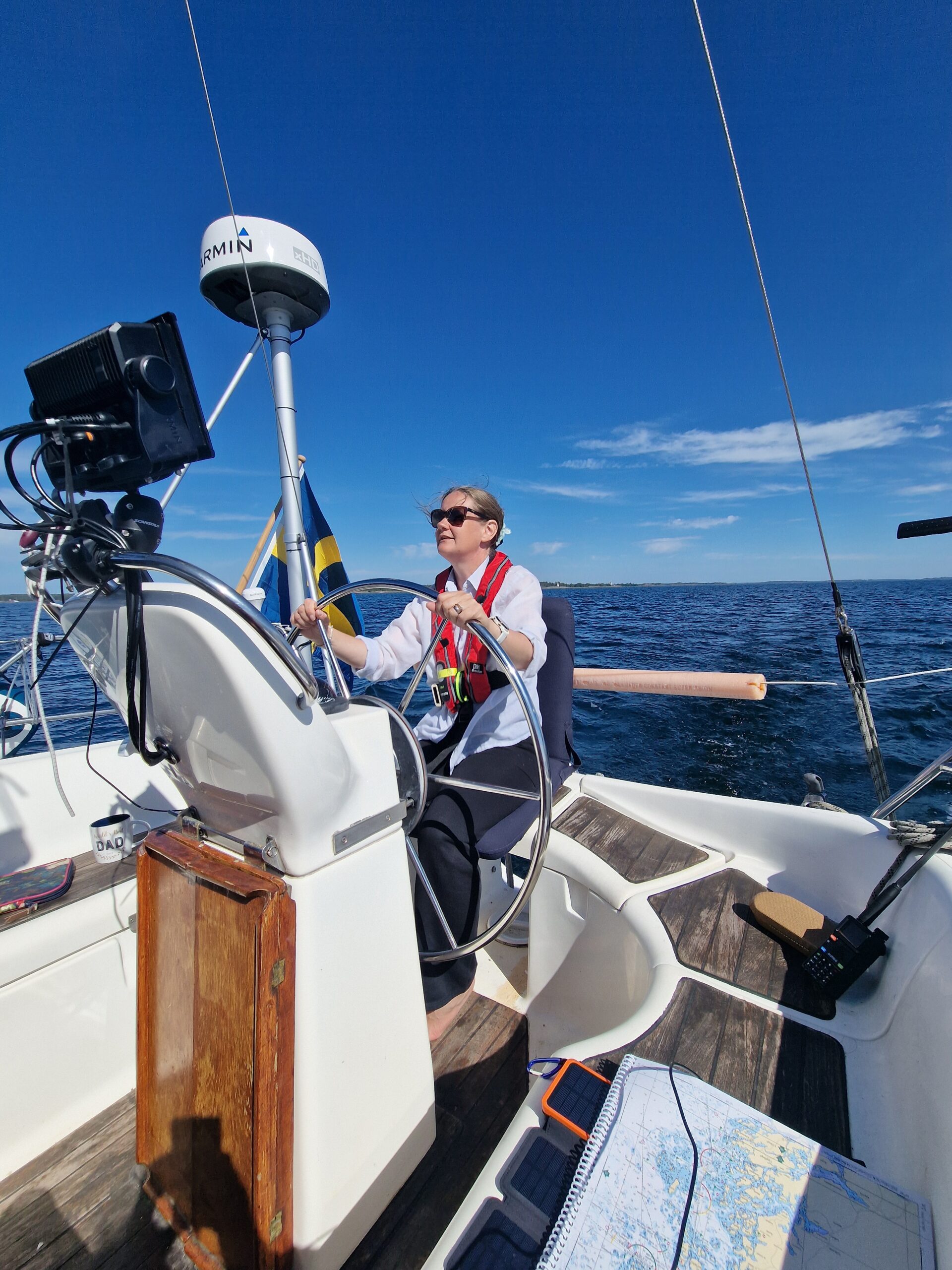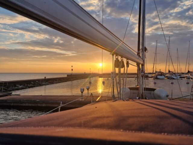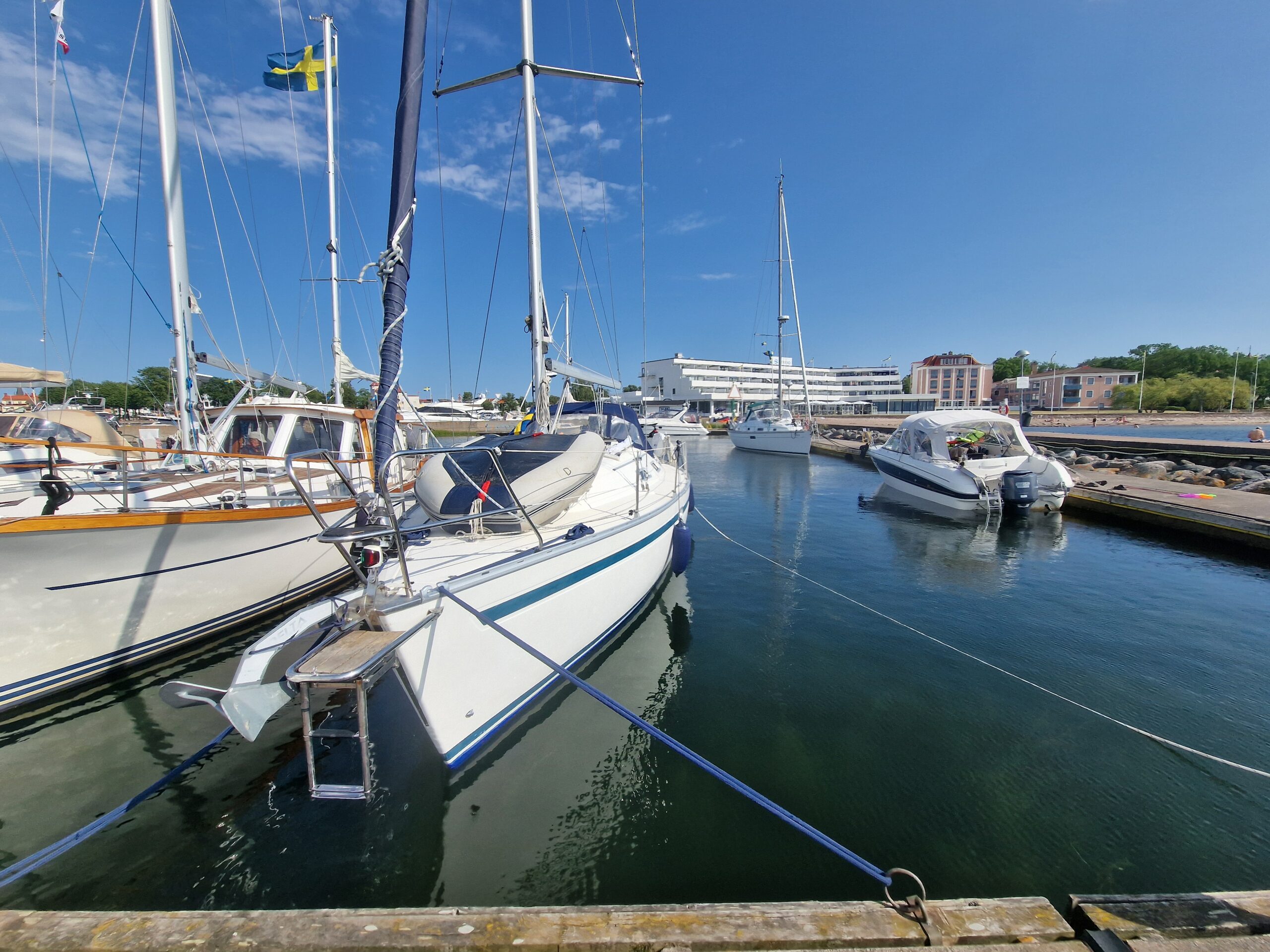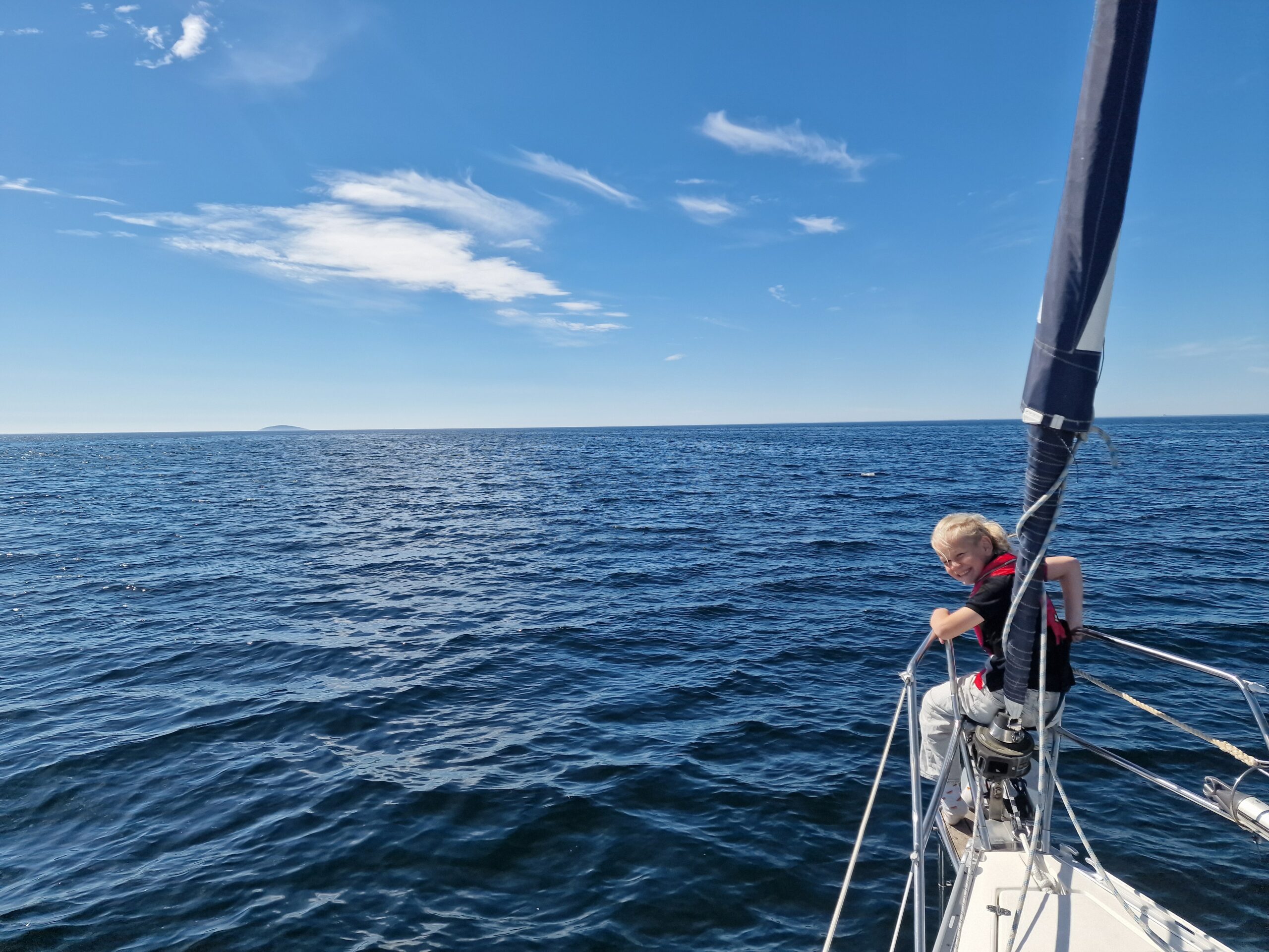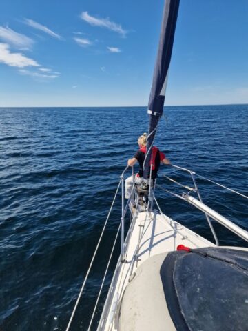 Efteråt fick jag förklarat vad dramatiken handlat om – stegen i fören var nerfällt, och det var på håret att det tog i flytbryggan. Troligen hade det fällts ner av vågorna under seglingen. Vi fick tipset att alltid säkra stegen med en segelstropp. En sådan där lärdom man tar med sig.