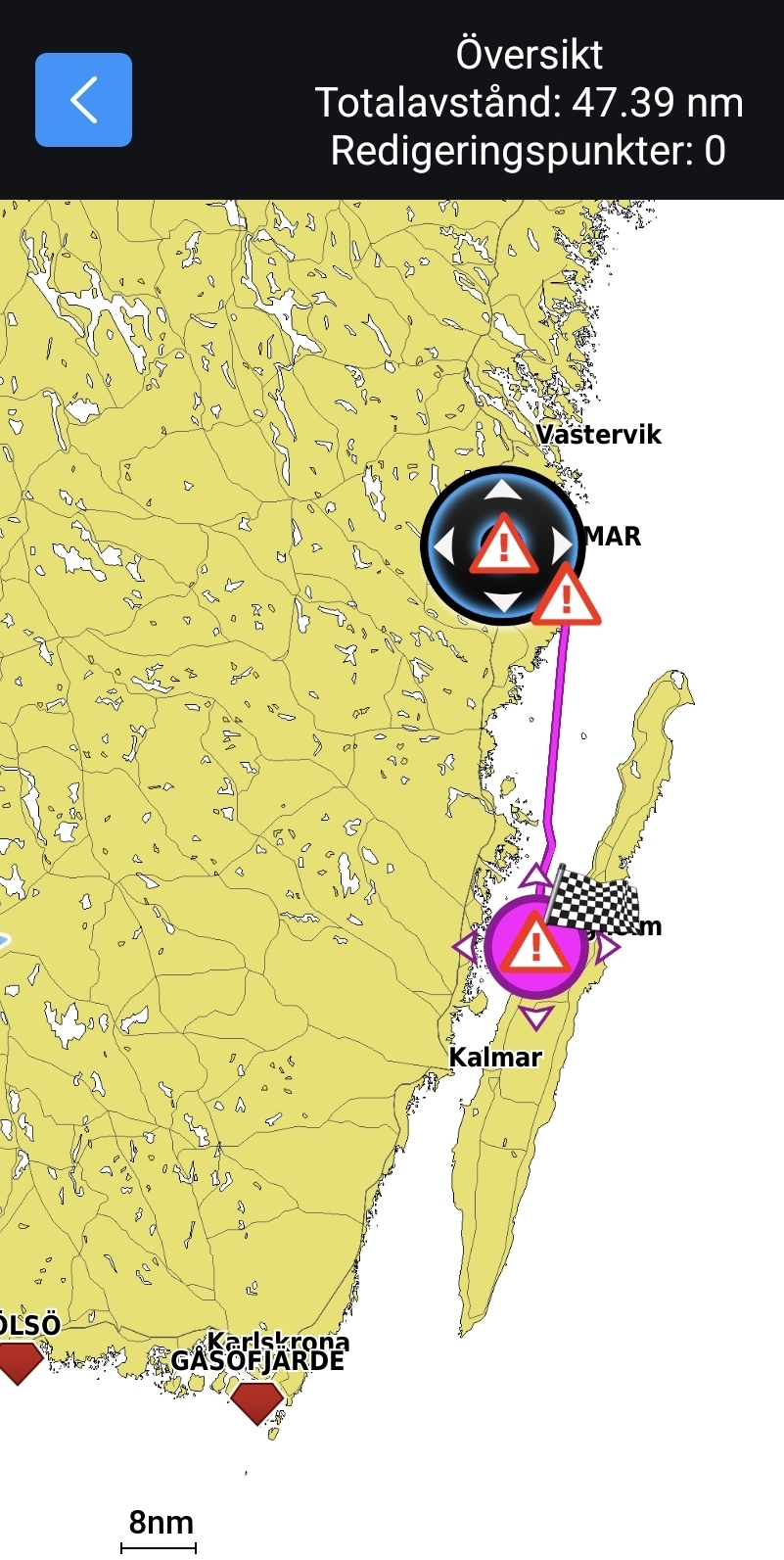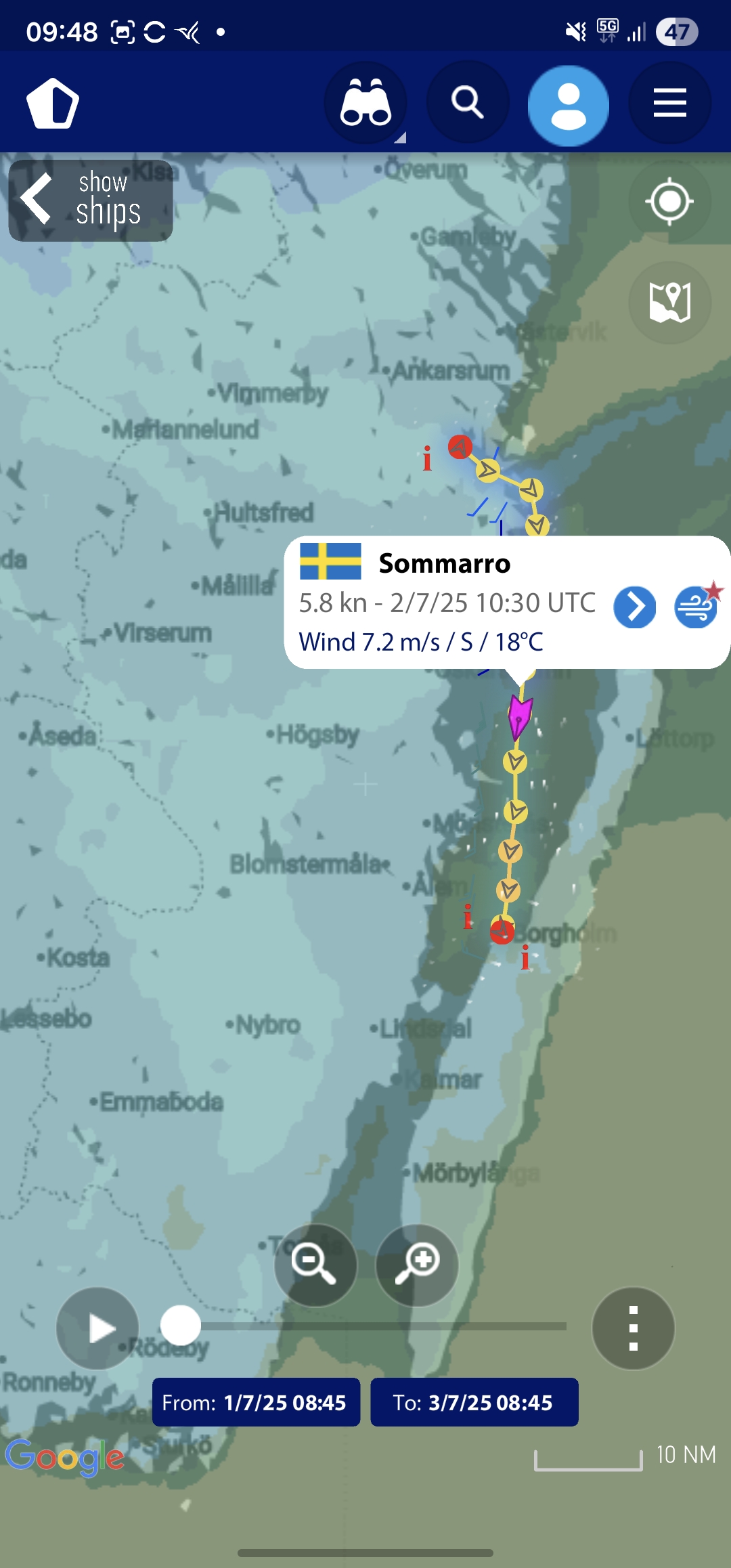 Tidigt på morgonen den 2 juli kastade vi loss och styrde ut mot Öland. Vi hade cirka 47 distansminuter framför oss och nådde Borgholm under eftermiddagen. På vägen passerade vi Blå Jungfrun utanför Oskarshamn och mötte Gotlandsfärjan som majestätiskt gled fram över Kalmarsund. Vinden var nästan rakt sydlig hela dagen.