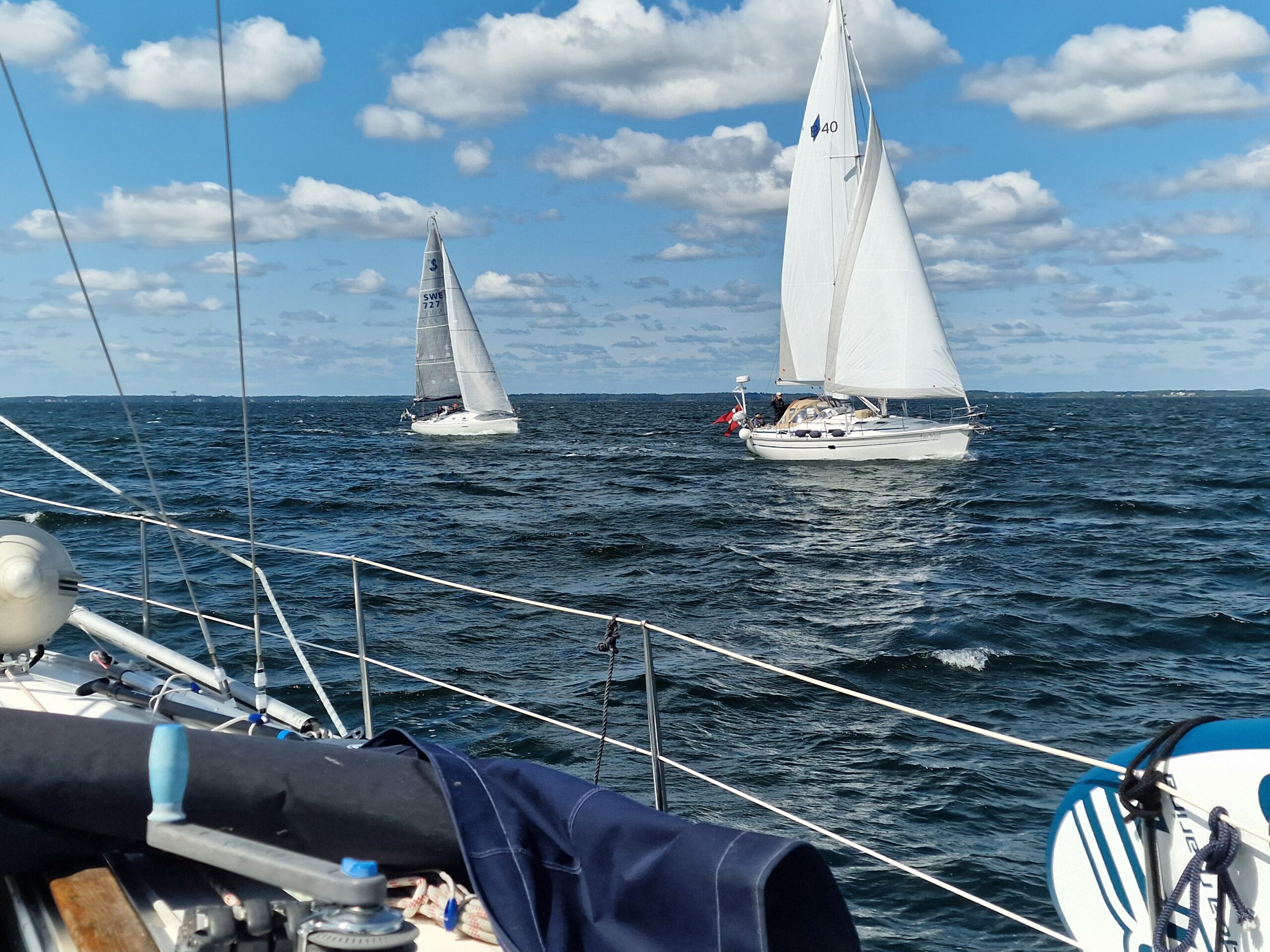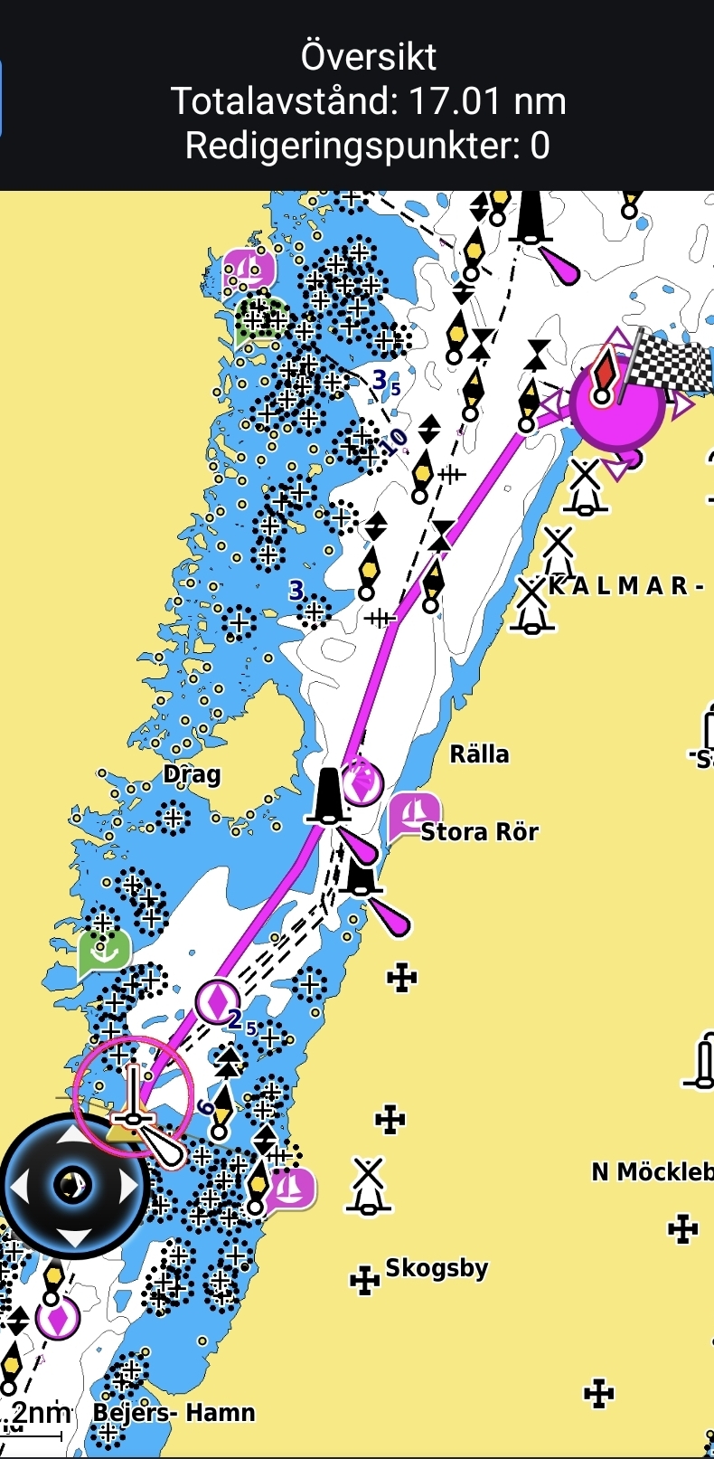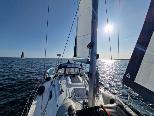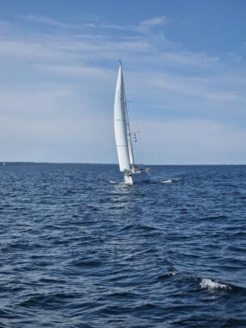 Vi gjorde ungefär 20 distans den dagen. Längs vägen blev vi omkörda av flera större motorbåtar på väg mot Kalmar, säkert med en marschfart på över 20 knop. Det är något speciellt med att ligga där i lugn segelfart och se dem svepa förbi – två helt olika sätt att uppleva havet.