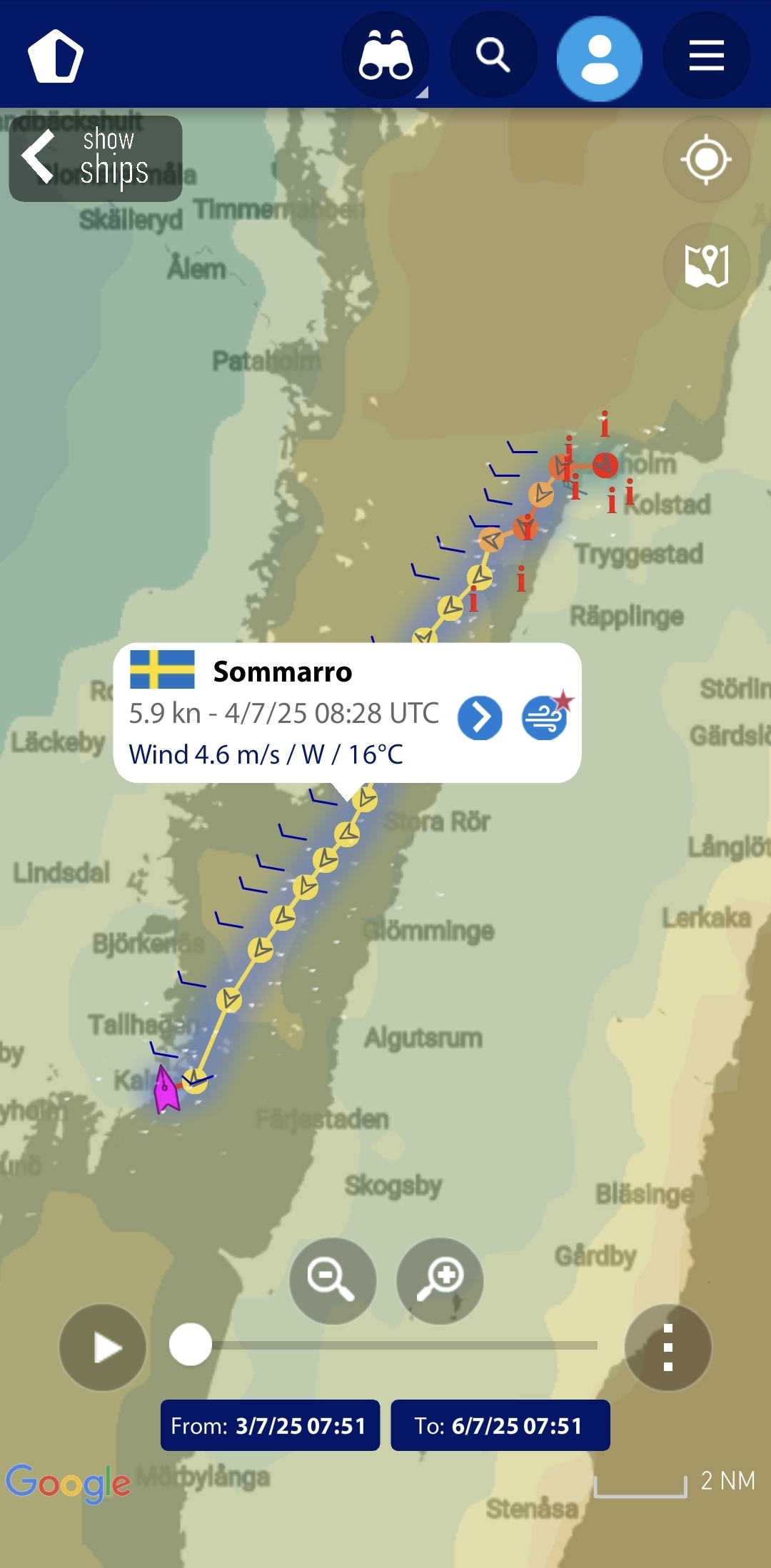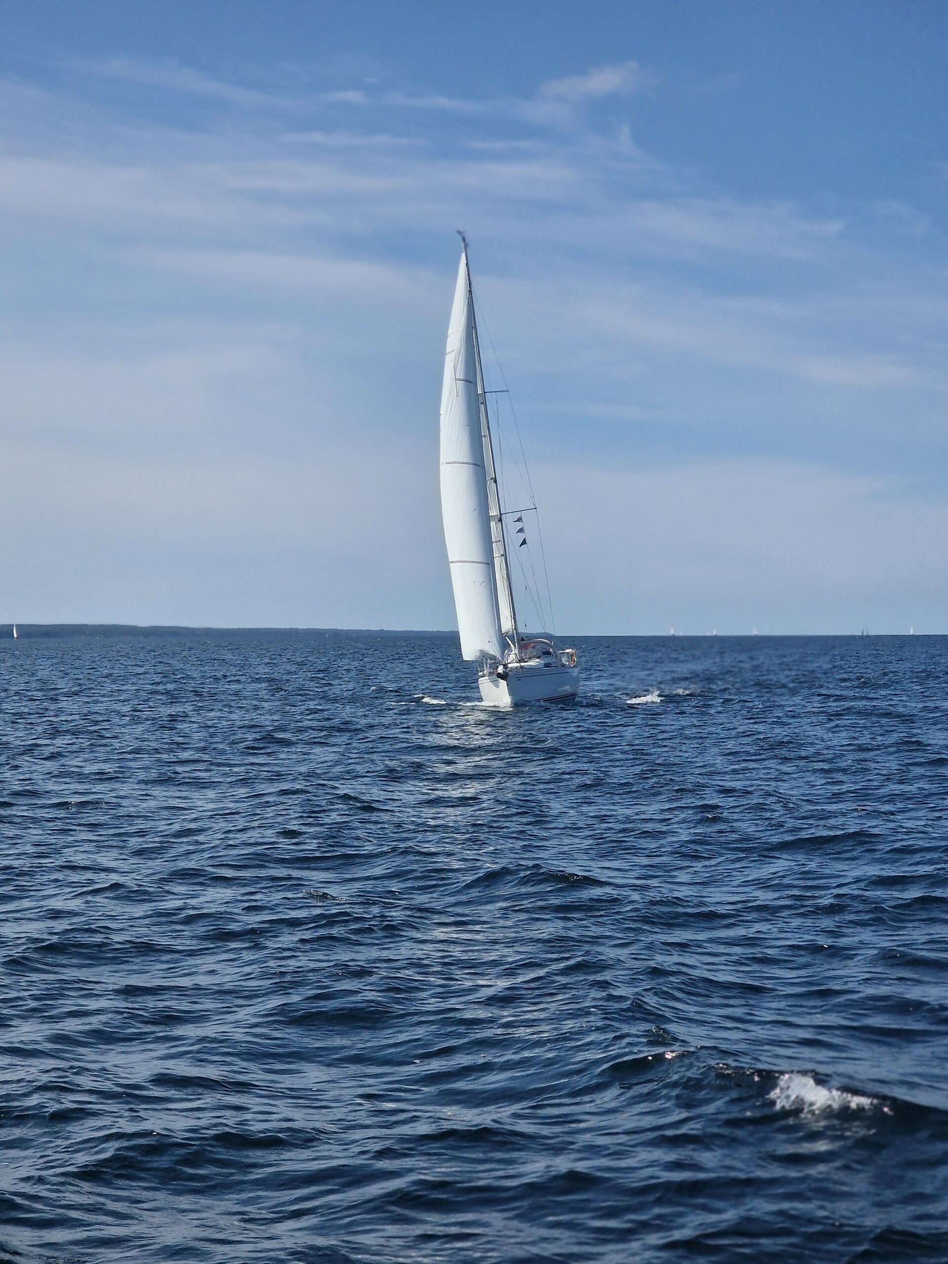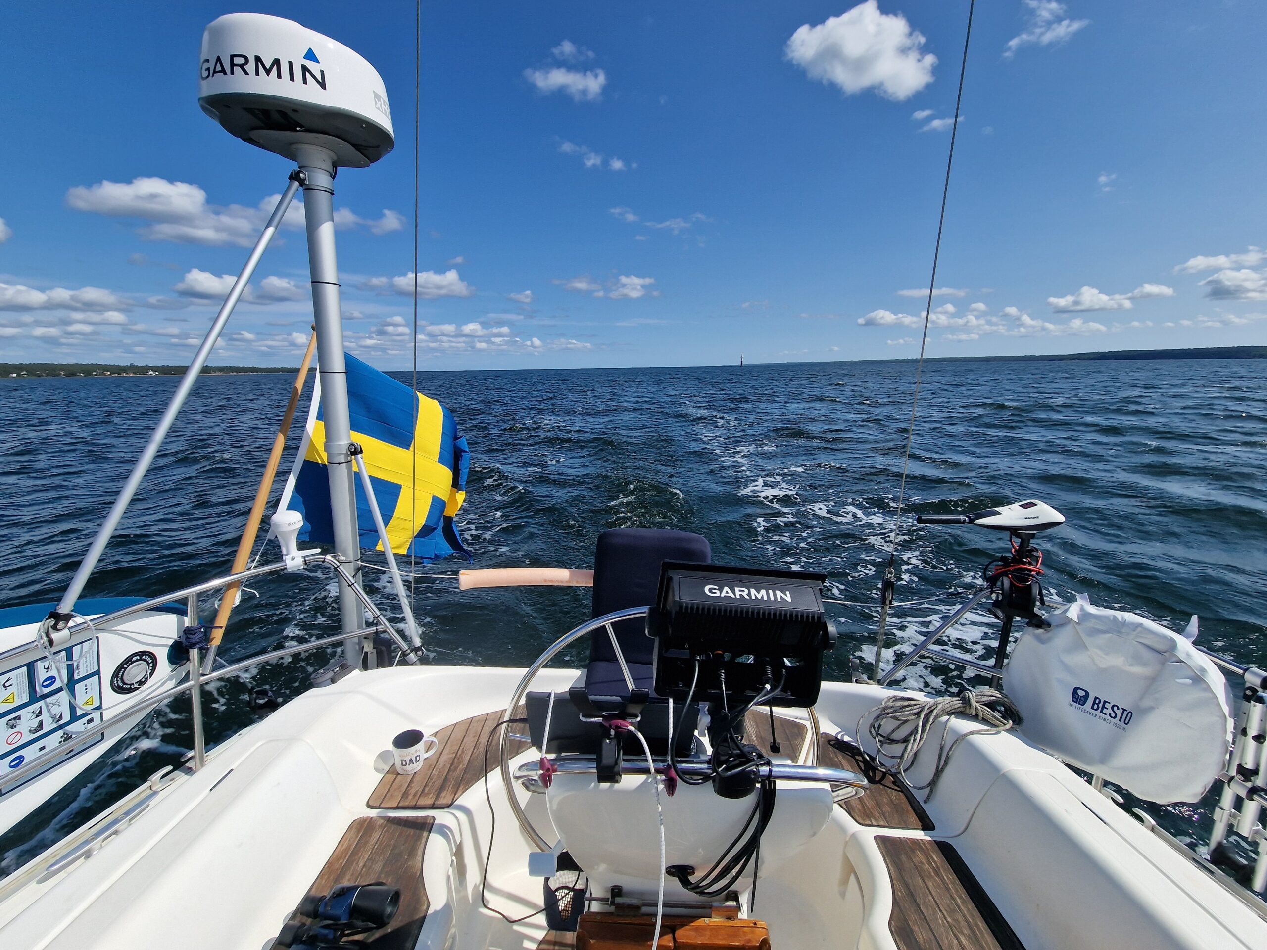 Vi gjorde ungefär 20 distans den dagen. Längs vägen blev vi omkörda av flera större motorbåtar på väg mot Kalmar, säkert med en marschfart på över 20 knop. Det är något speciellt med att ligga där i lugn segelfart och se dem svepa förbi – två helt olika sätt att uppleva havet.