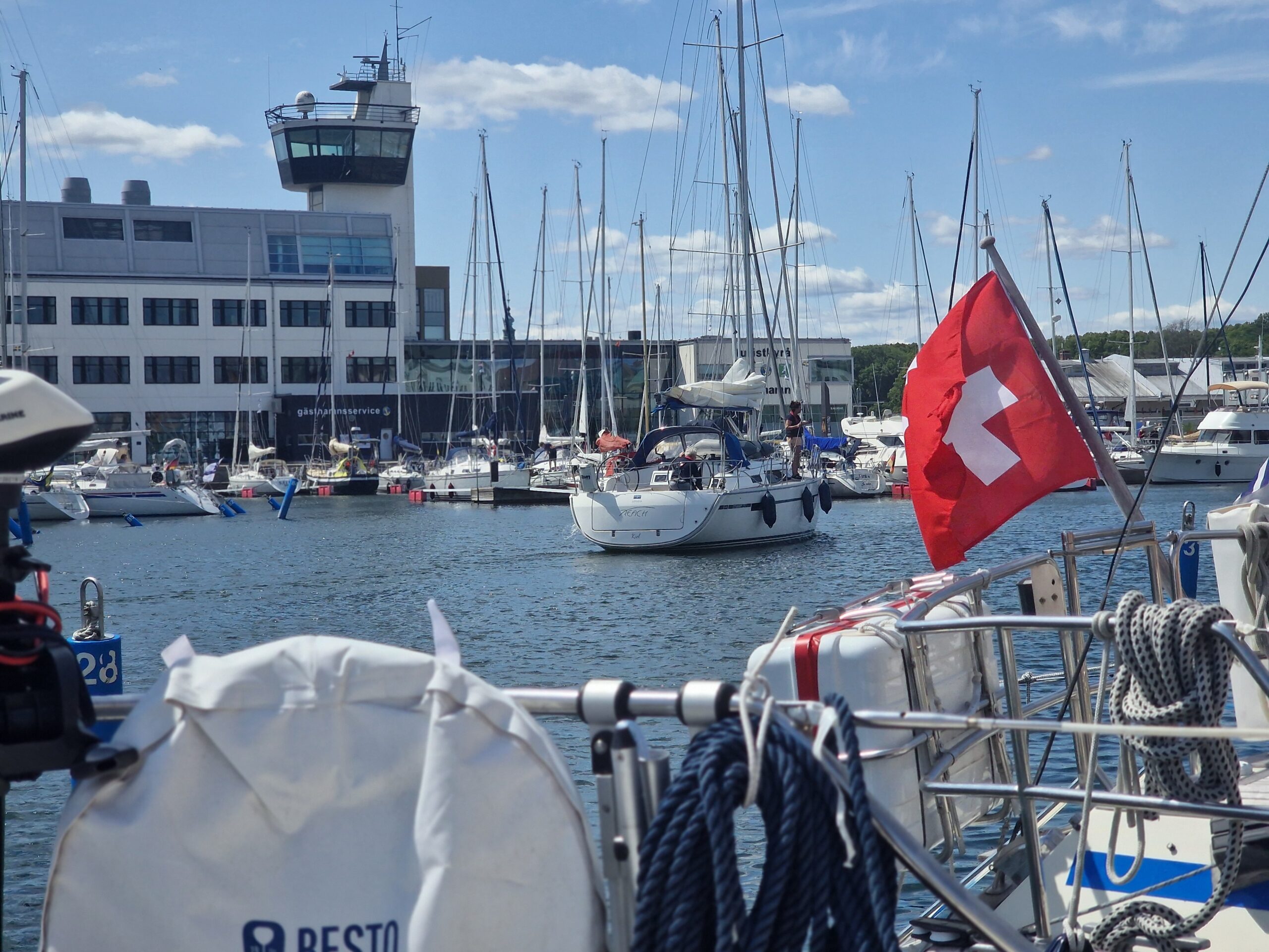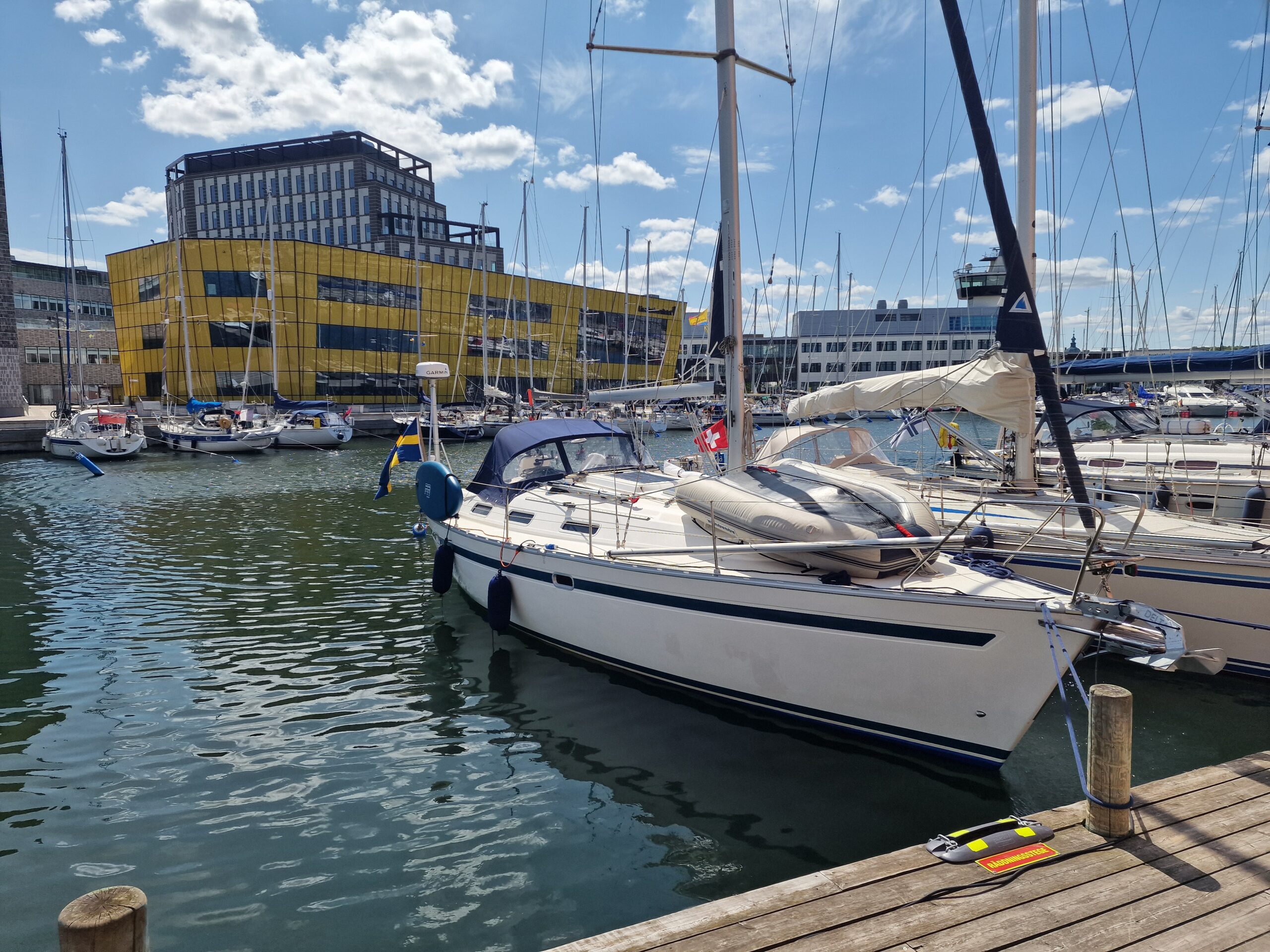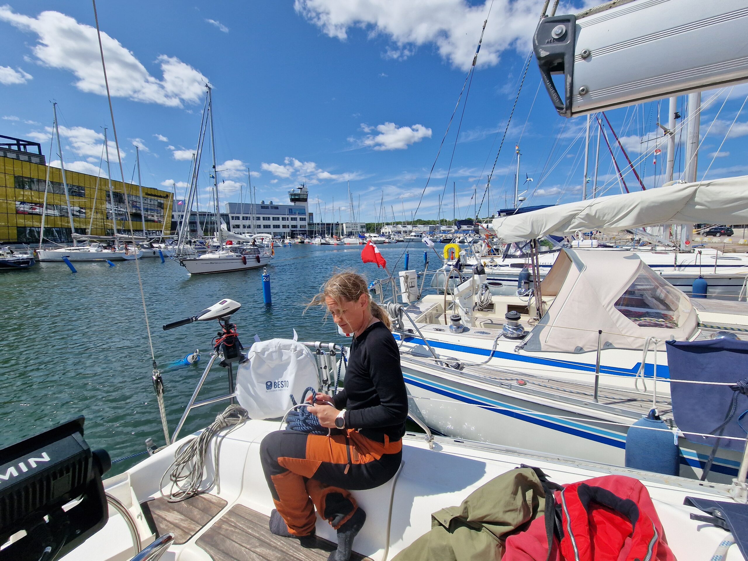 Hela hamnen var proppfull, och vi hade turen att knipa en av de sista platserna. Det blåste kuling under hela vistelsen, så båtarna låg kvar dag efter dag. Stämningen blev nästan lite internationell festival över det hela. När vi var där var kanske bara tio procent svenska båtar – resten kom från alla möjliga håll. Vår närmaste granne var från Schweiz, med tidigare hemmahamn i Holland men numera Oskarshamn. I övrigt låg där gott om tyska, danska, finska och polska båtar.