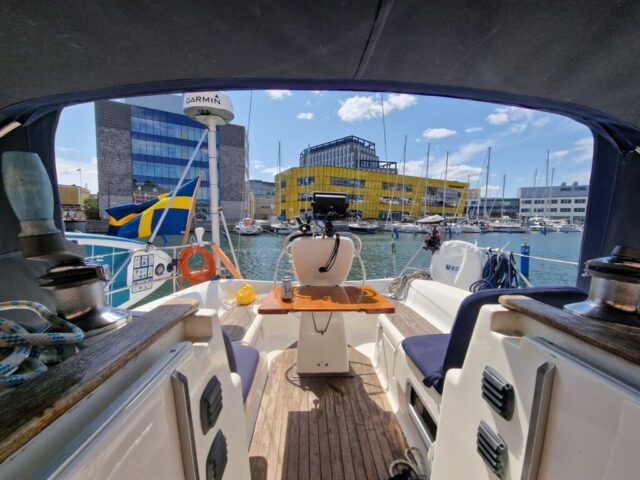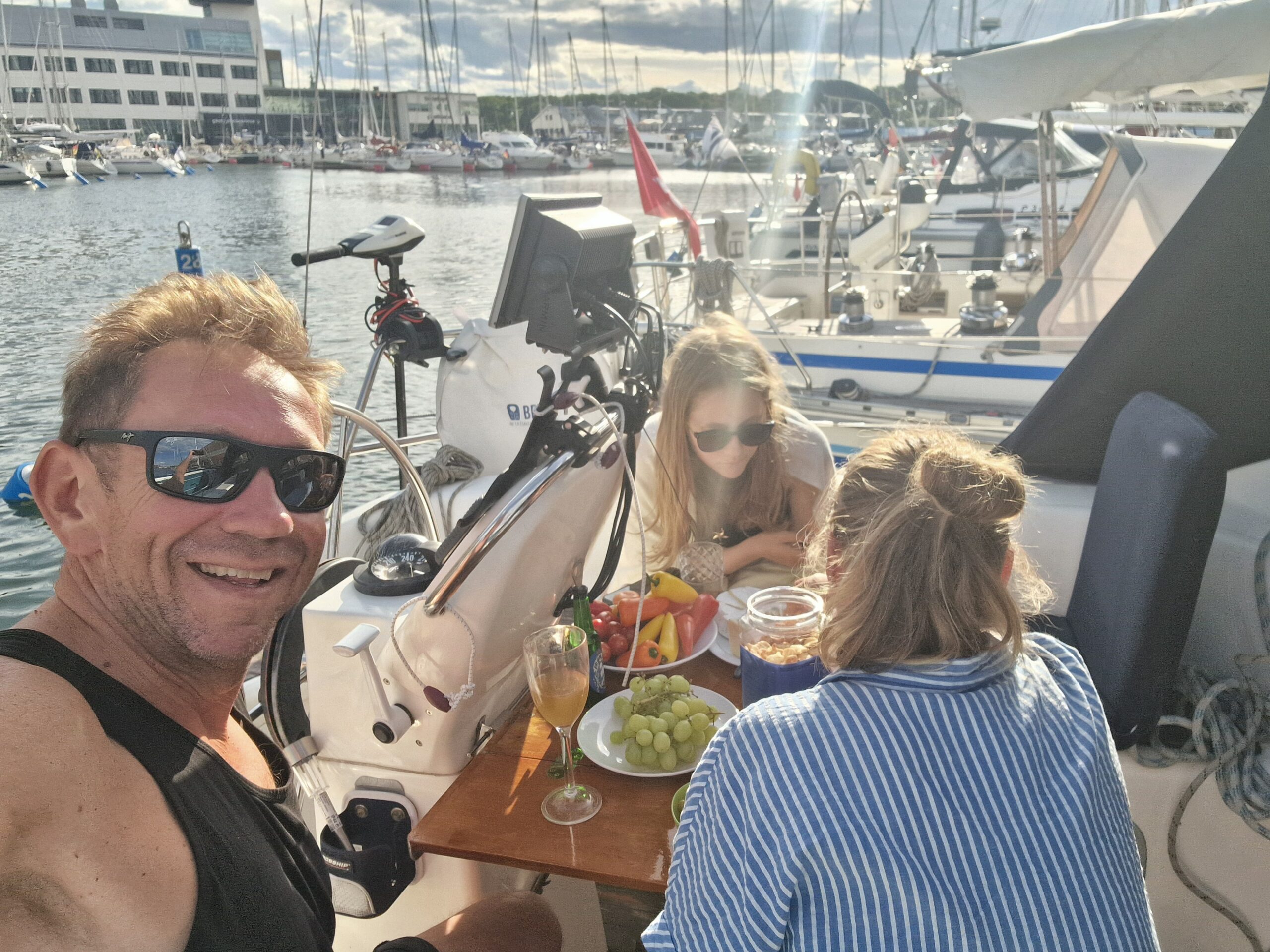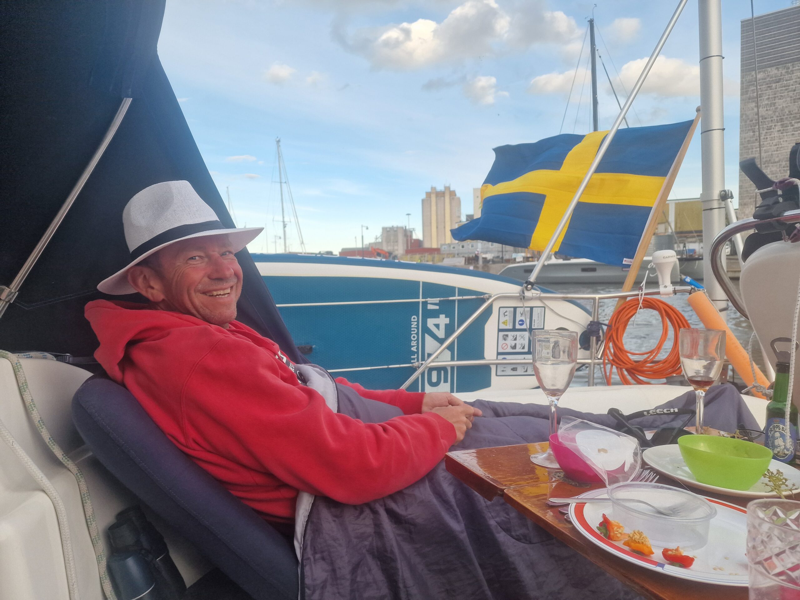 Hela hamnen var proppfull, och vi hade turen att knipa en av de sista platserna. Det blåste kuling under hela vistelsen, så båtarna låg kvar dag efter dag. Stämningen blev nästan lite internationell festival över det hela. När vi var där var kanske bara tio procent svenska båtar – resten kom från alla möjliga håll. Vår närmaste granne var från Schweiz, med tidigare hemmahamn i Holland men numera Oskarshamn. I övrigt låg där gott om tyska, danska, finska och polska båtar.