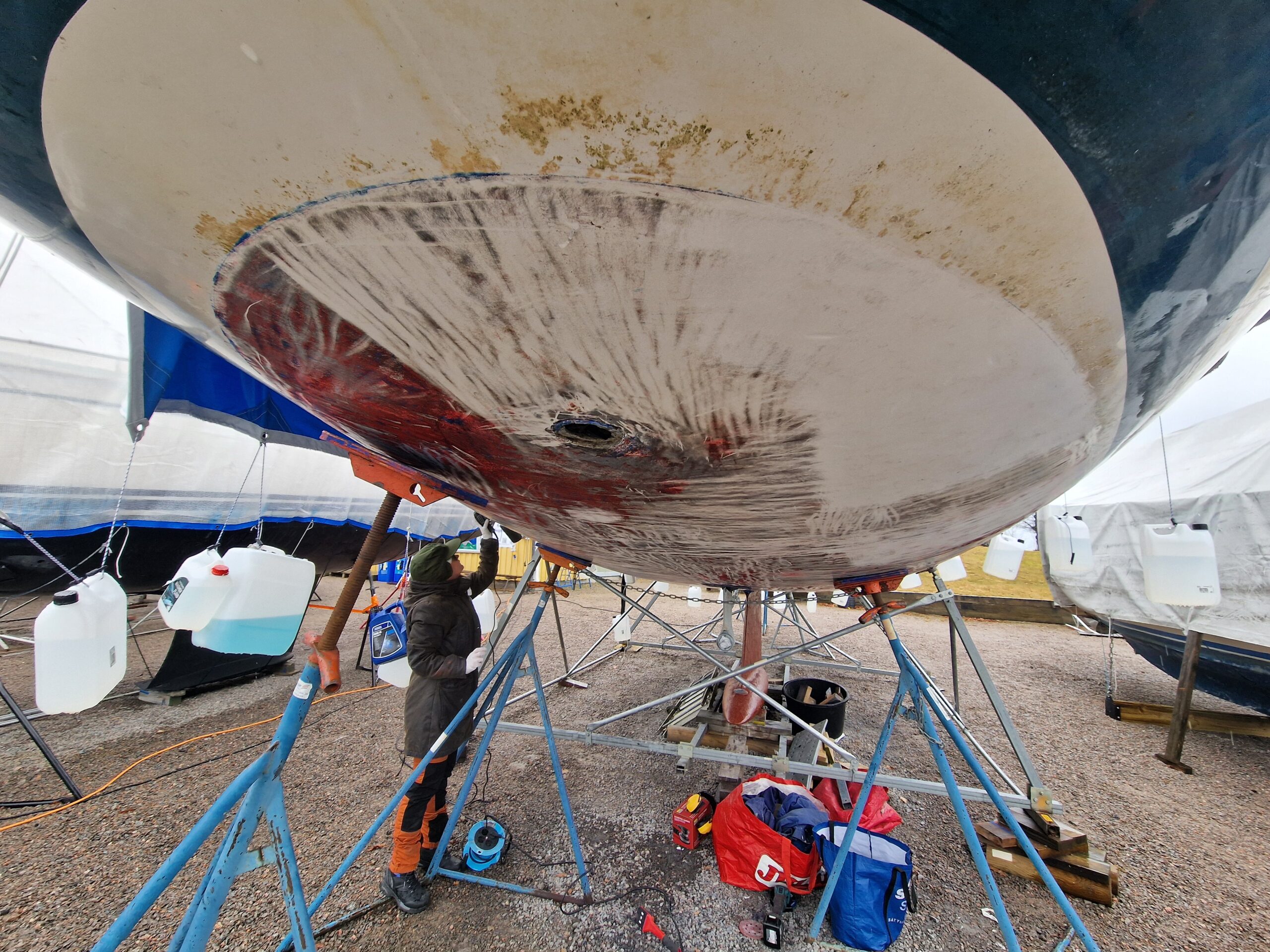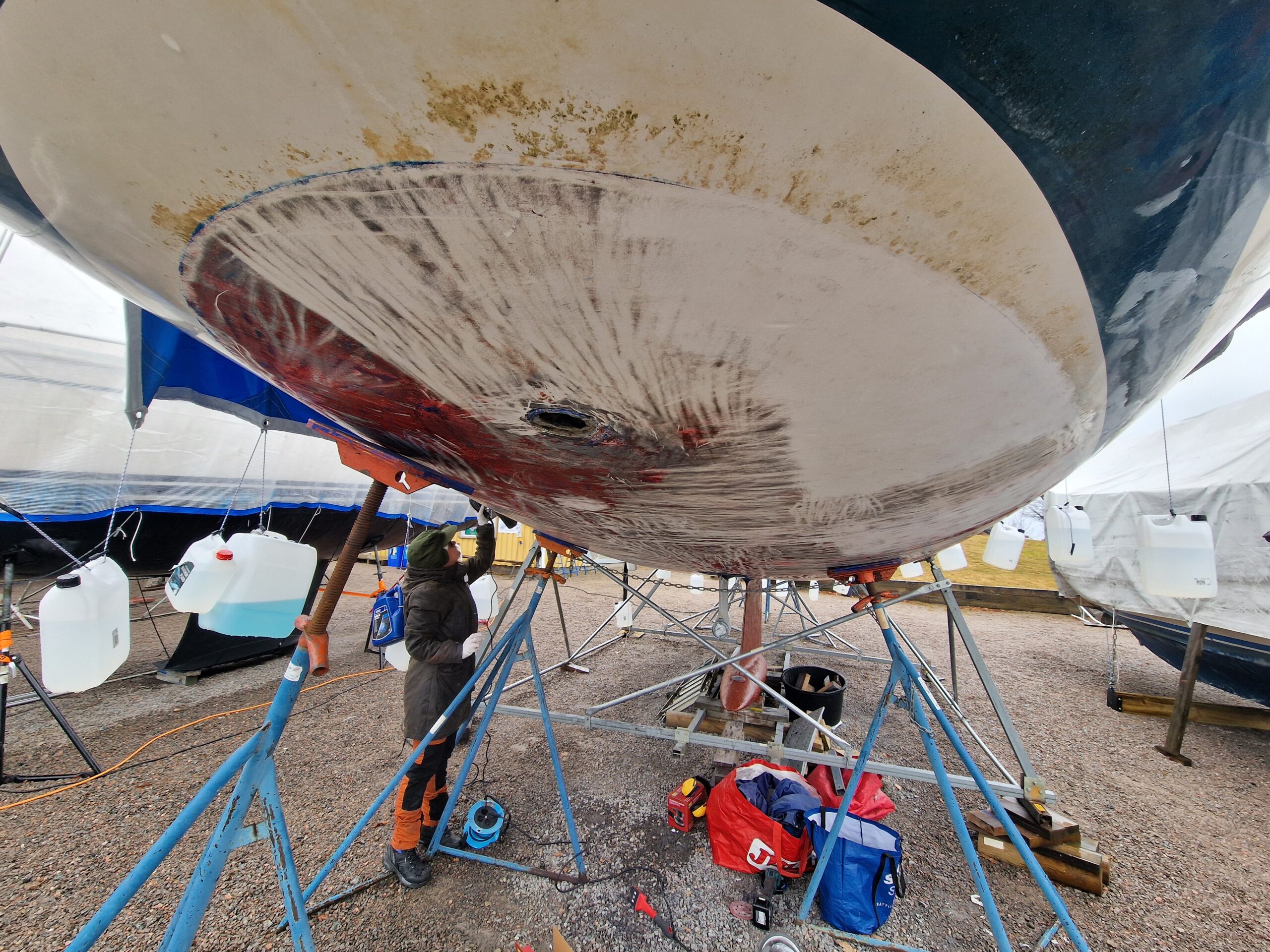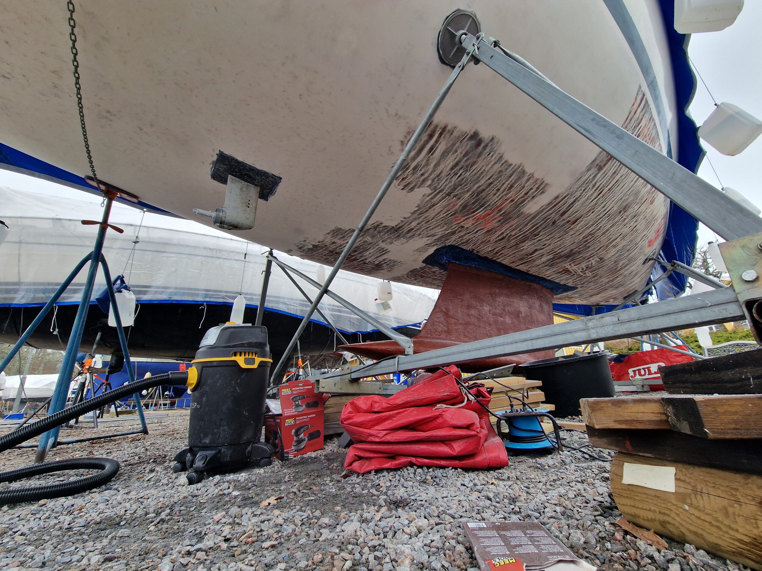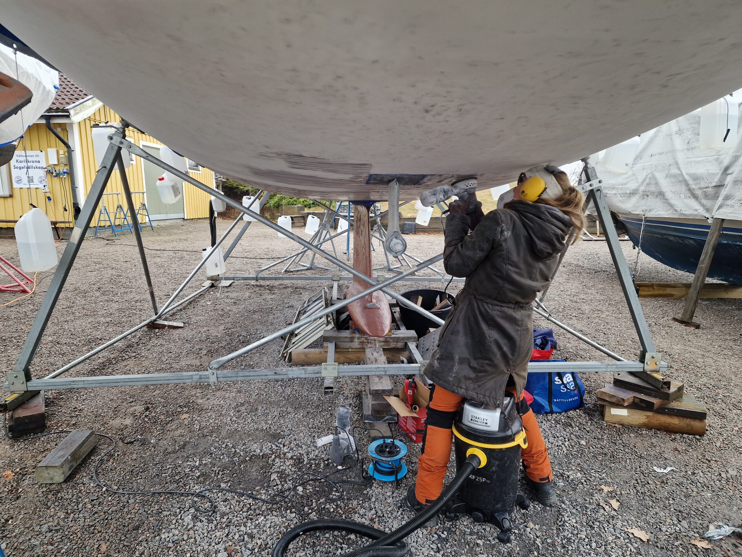 Vi började också slipa rodret lite här hemma innan vi åkte ner, så dagens arbete – nu på söndagen – blir att fortsätta med det.
