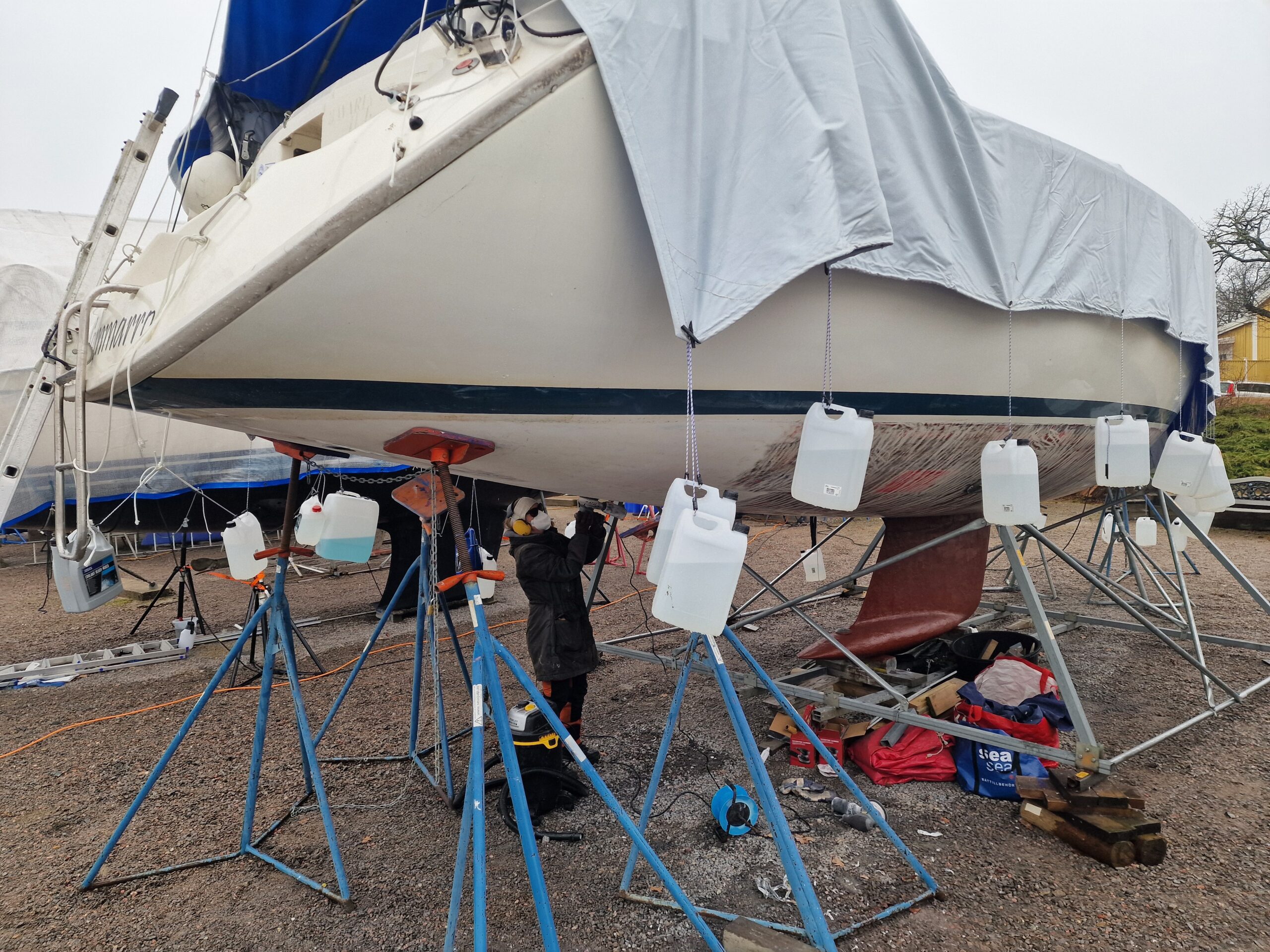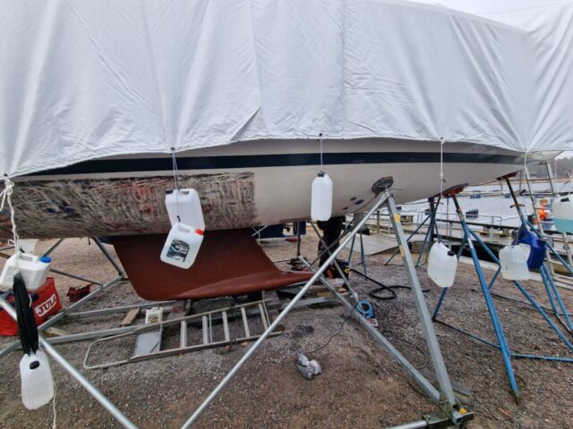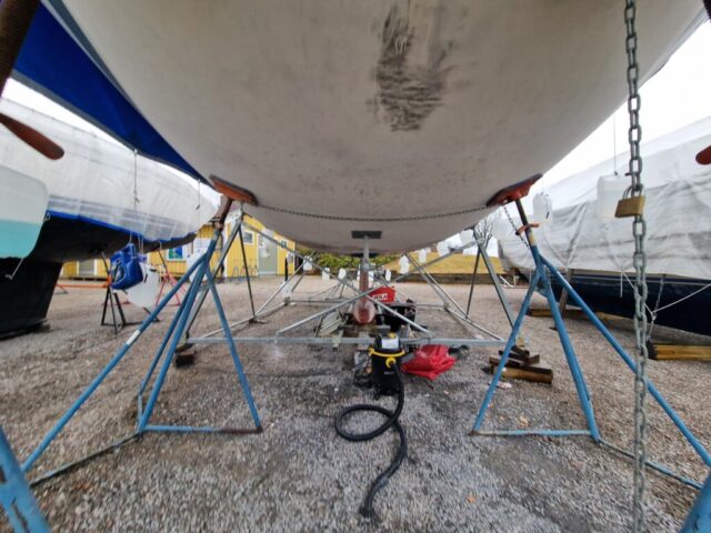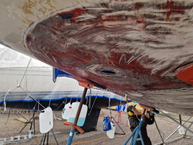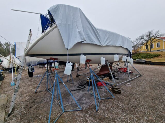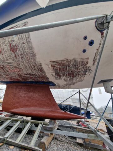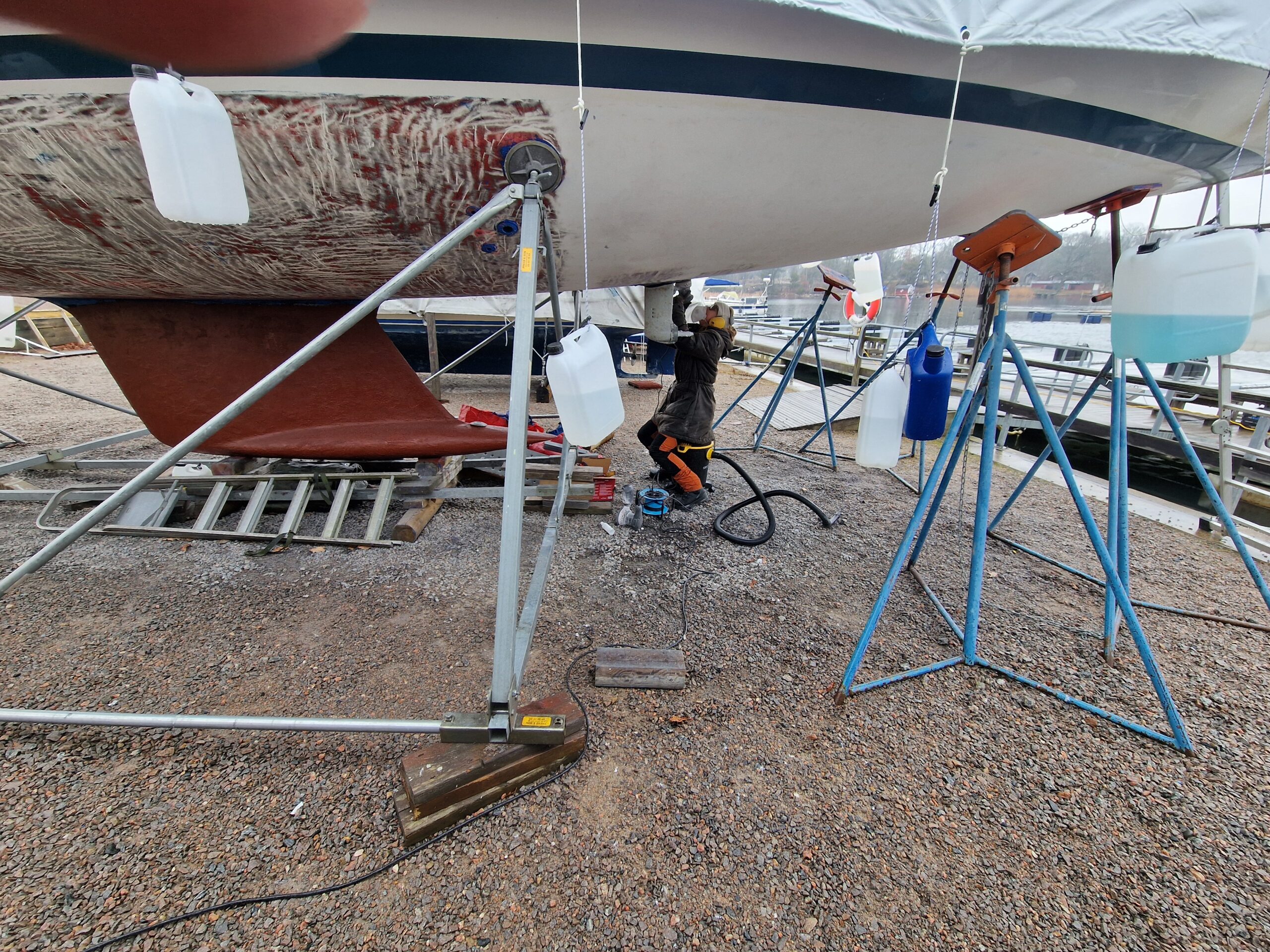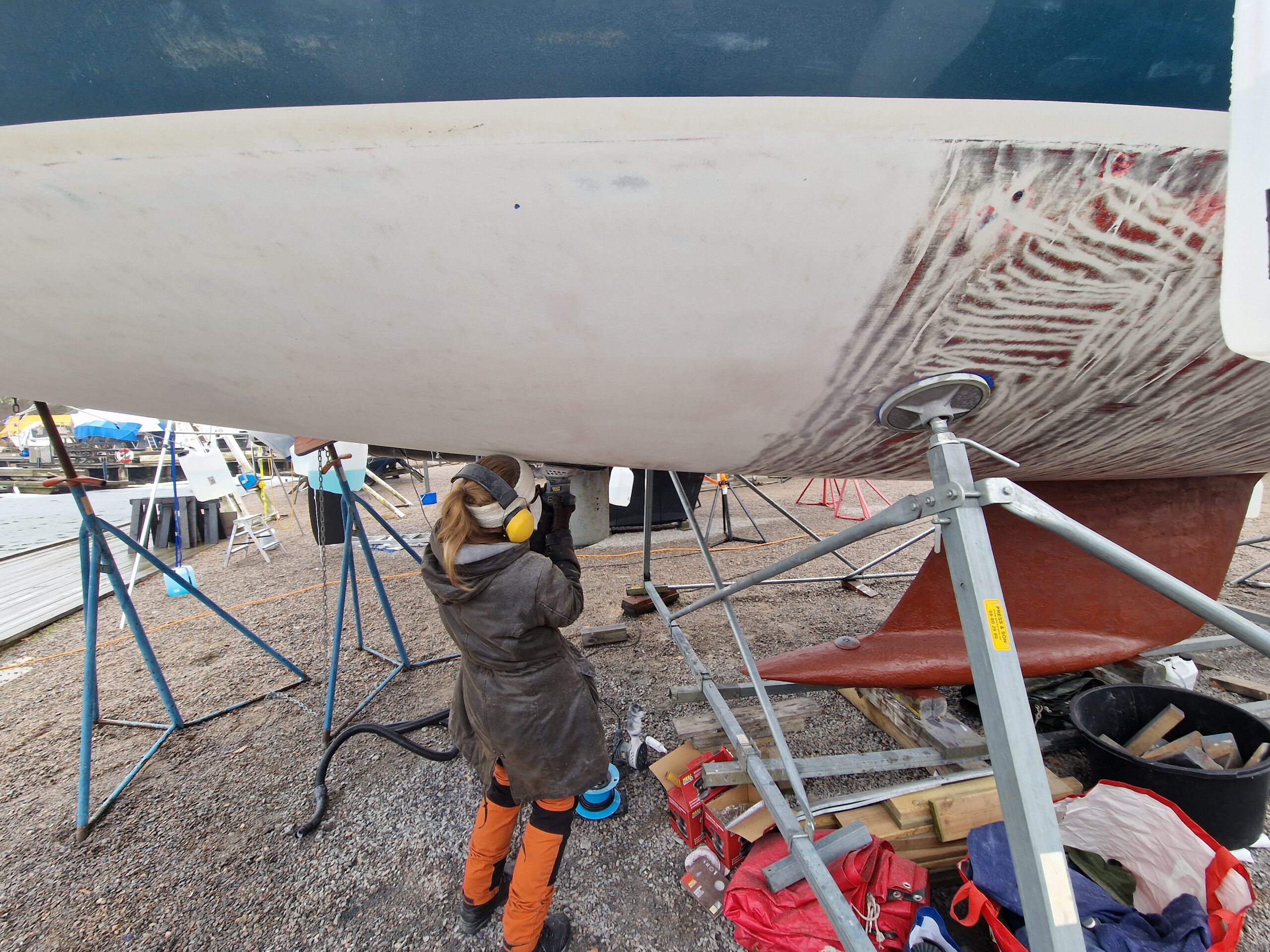 Vi började också slipa rodret lite här hemma innan vi åkte ner, så dagens arbete – nu på söndagen – blir att fortsätta med det.