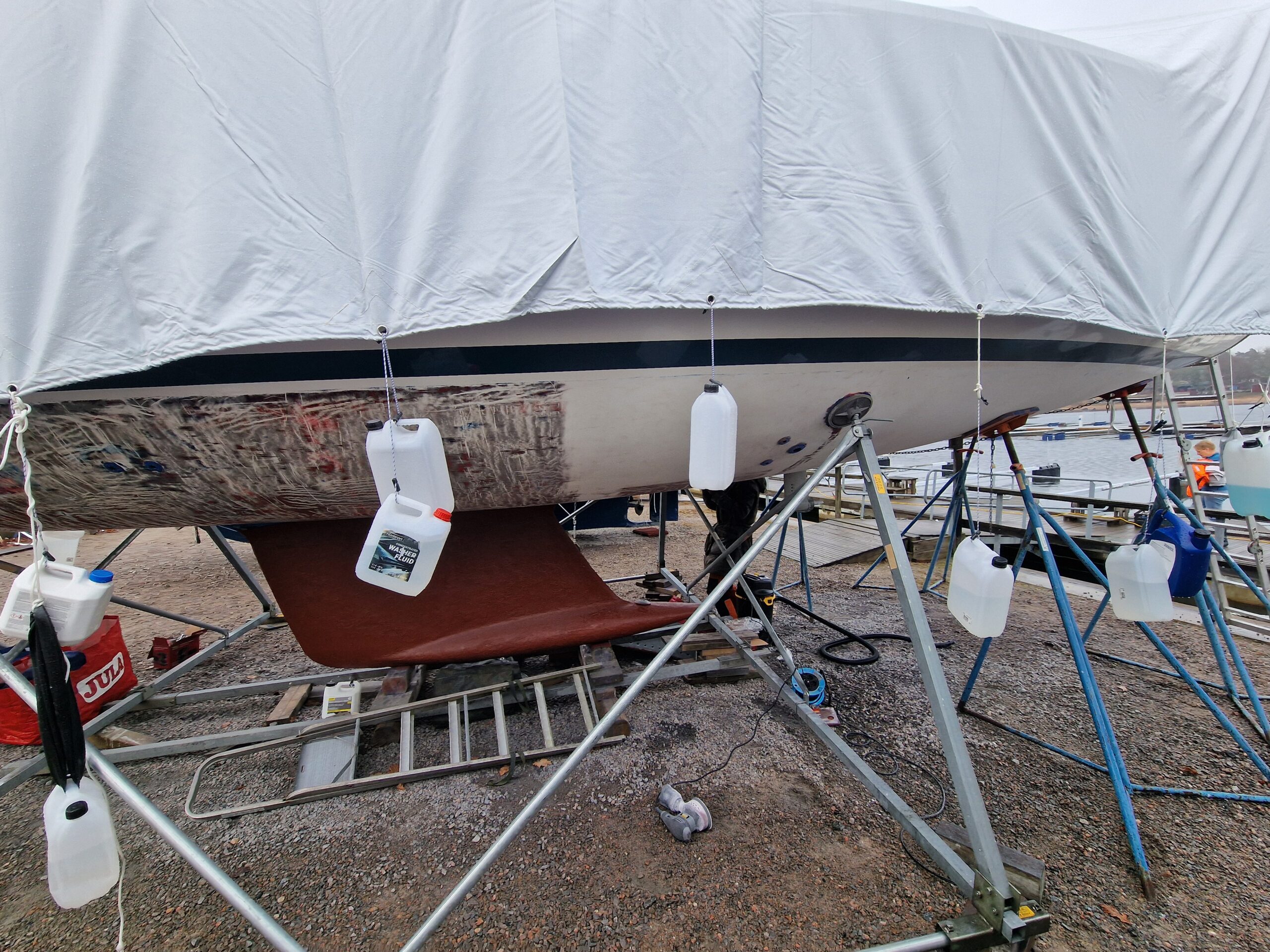 När dagen var slut hade vi hunnit slipa nästan halva båten. Förhoppningen är att kunna ta resten av botten nästa lördag.