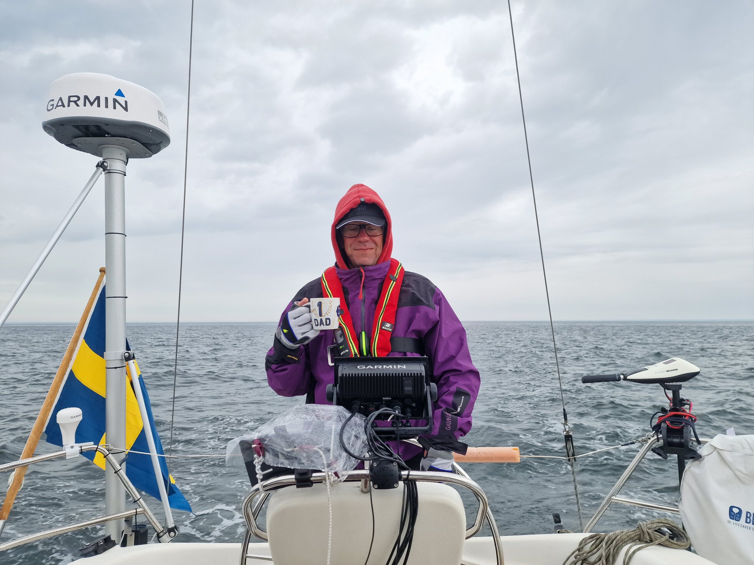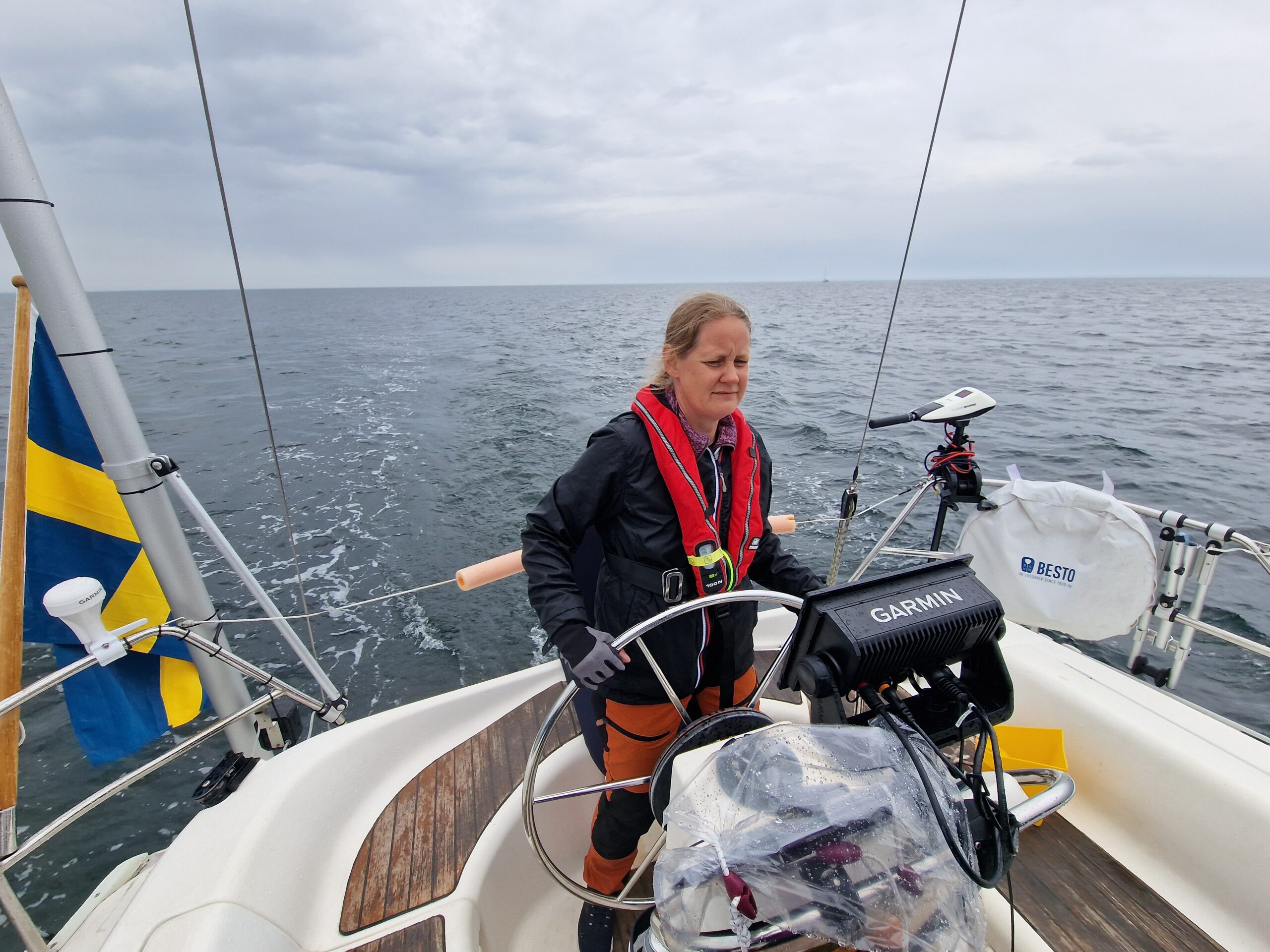 Vädret bjöd på en salig blandning: mulet emellanåt och bitvis rak motvind som fick oss att jobba för varje sjömil. Men det är ju det som är segling – lite kamp, lite tålamod och desto mer belöning. Angela lagade middag ombord som vi åt ute i sittbrunnen medan båten stadigt tog oss söderut. Mitt ute på Kalmarsund hann vi till och med spela gitarr, cello och fiol. Det är något speciellt med musik över öppet vatten – tonerna bär långt och stunden känns nästan högtidlig.