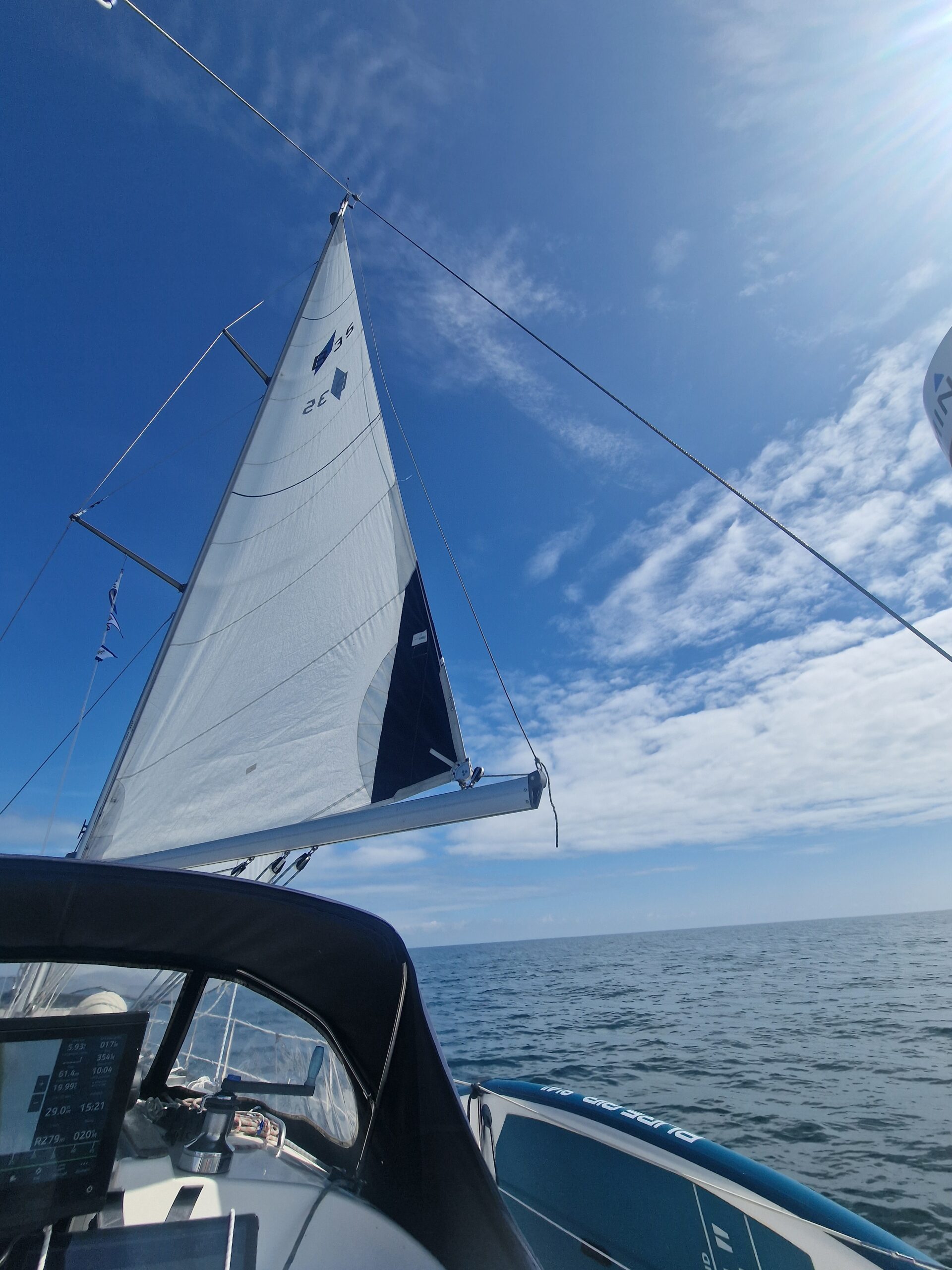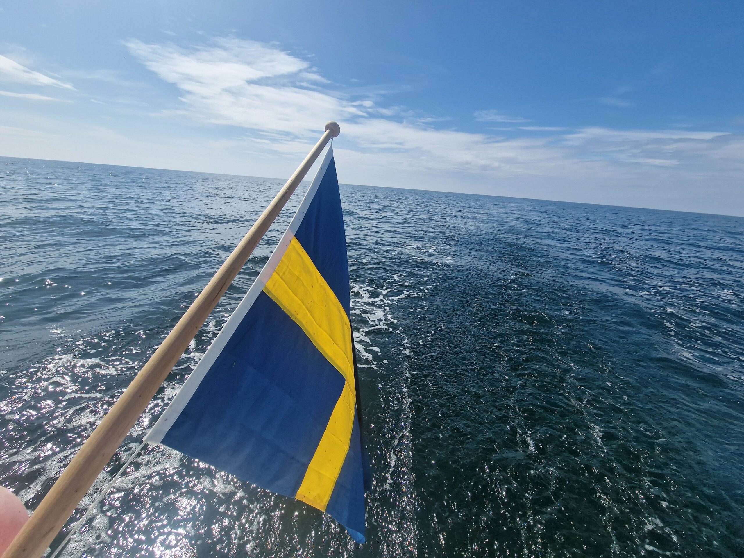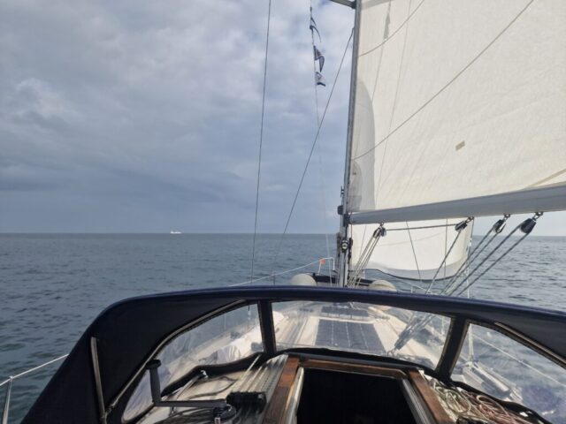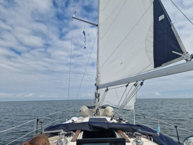 Söndag den 27 juli, klockan halv sex på morgonen, styrde vi ut från hamnen i Tejn. Prognosen visade kuling från måndagen och nästan en veckas hårt väder, så vi valde det säkra före det osäkra och gav oss av en dag tidigare än planerat. Det kändes som lugnet före stormen – den första tredjedelen av överfarten bjöd på väldigt lite vind och vi fick motorsegla för att hålla farten uppe.
