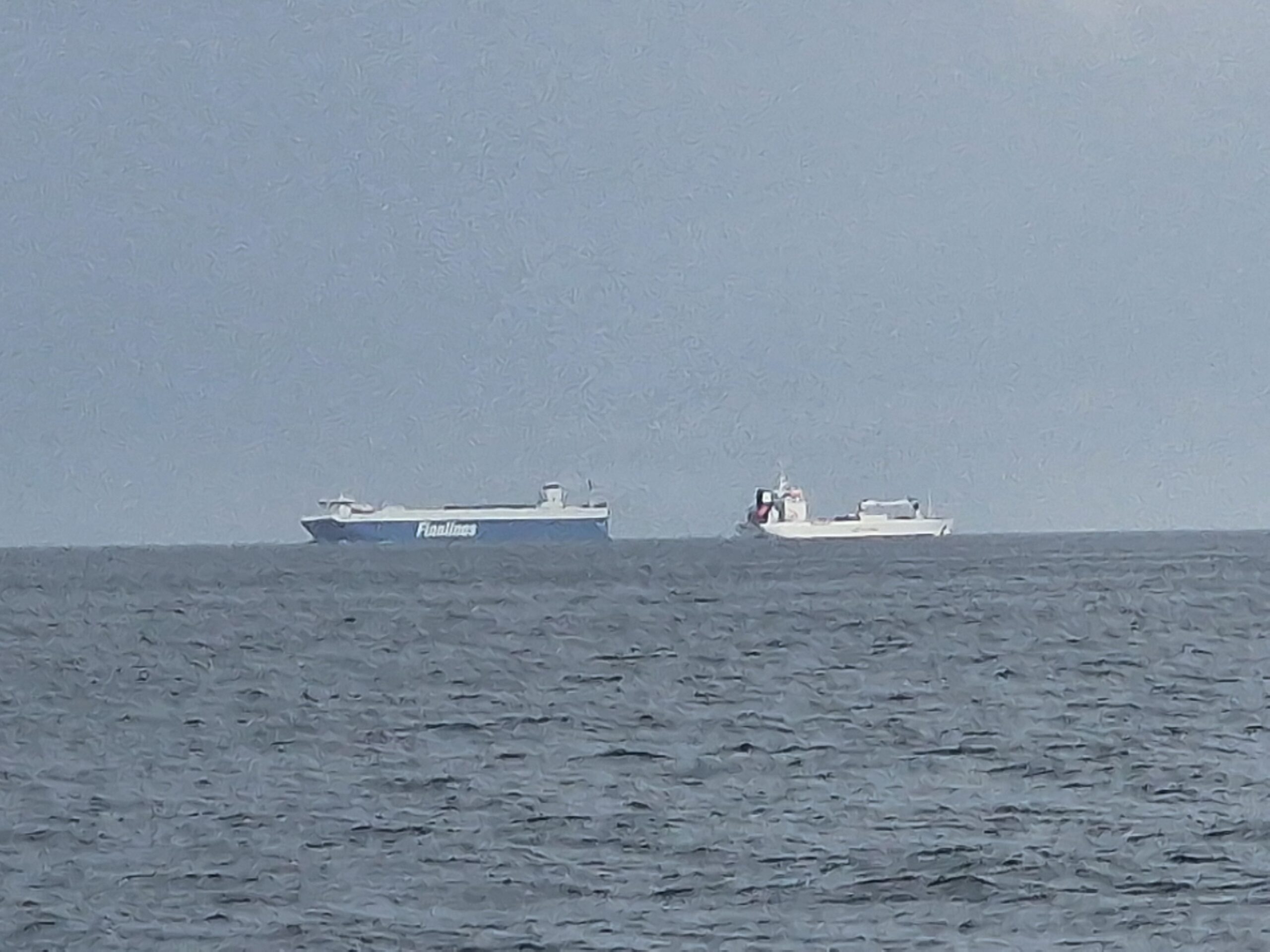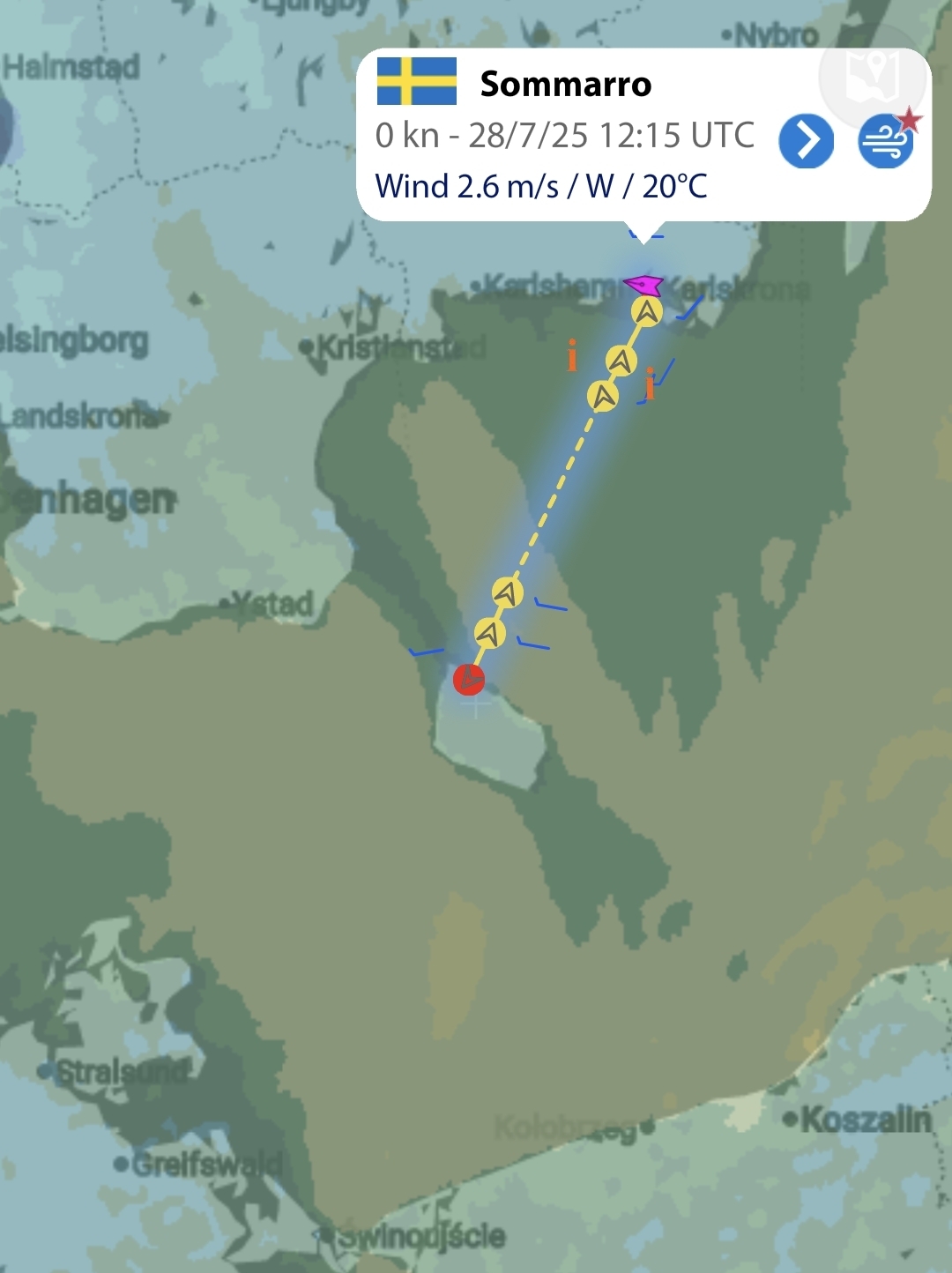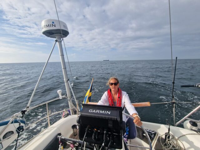 Flera stora fraktfartyg dök upp på AIS:en som små ufon på skärmen. De närmade sig snabbt i trafikleden, som kändes oändlig där ute. Det var en skön känsla när vi såg på plottern hur Sommarro passerade gränsen och vi kunde fortsätta utanför fartygens ”motorväg”.