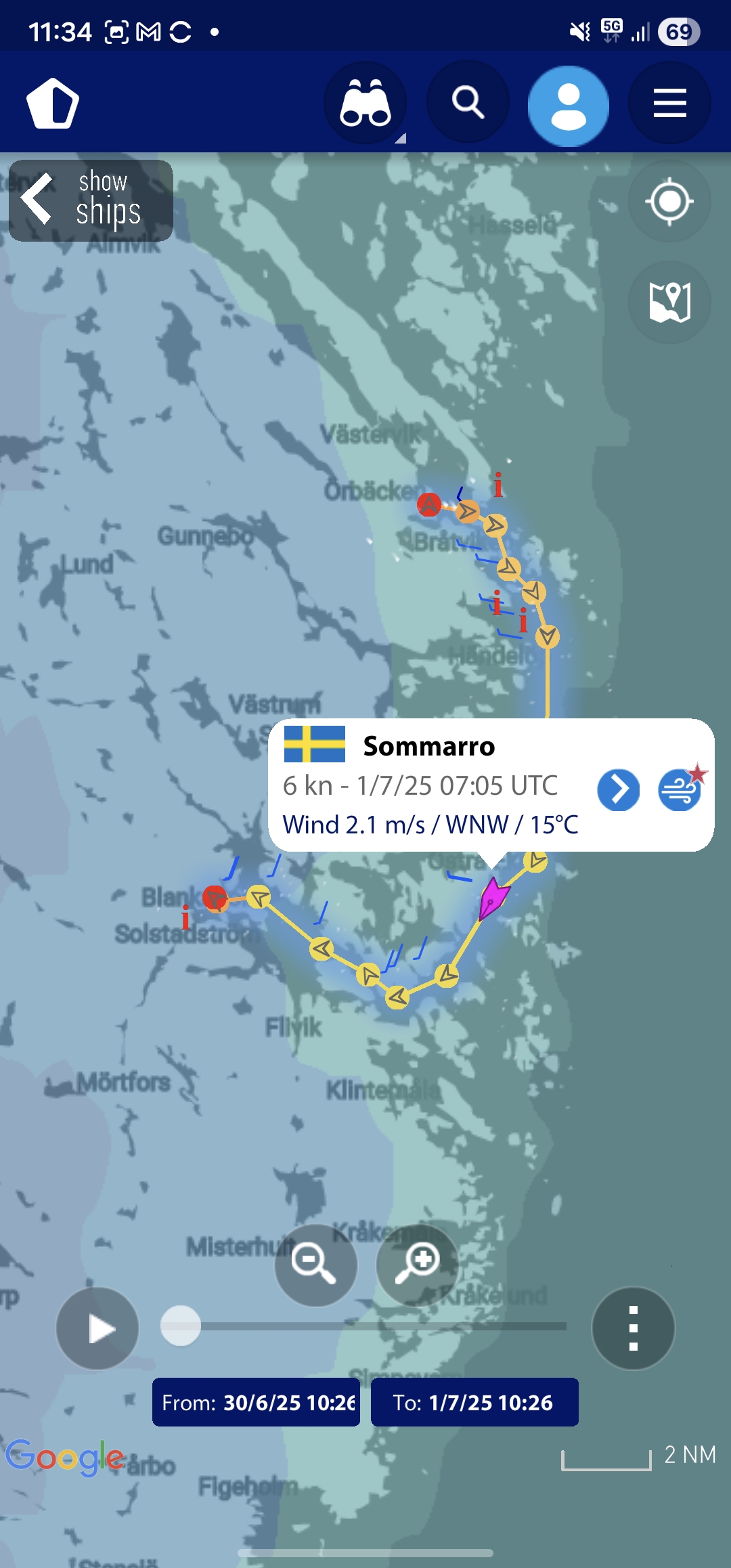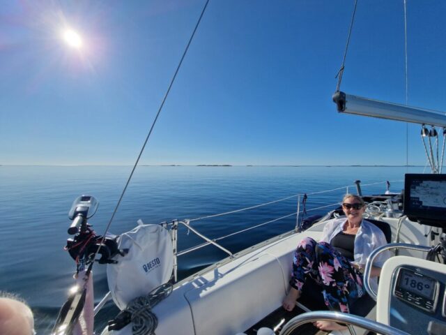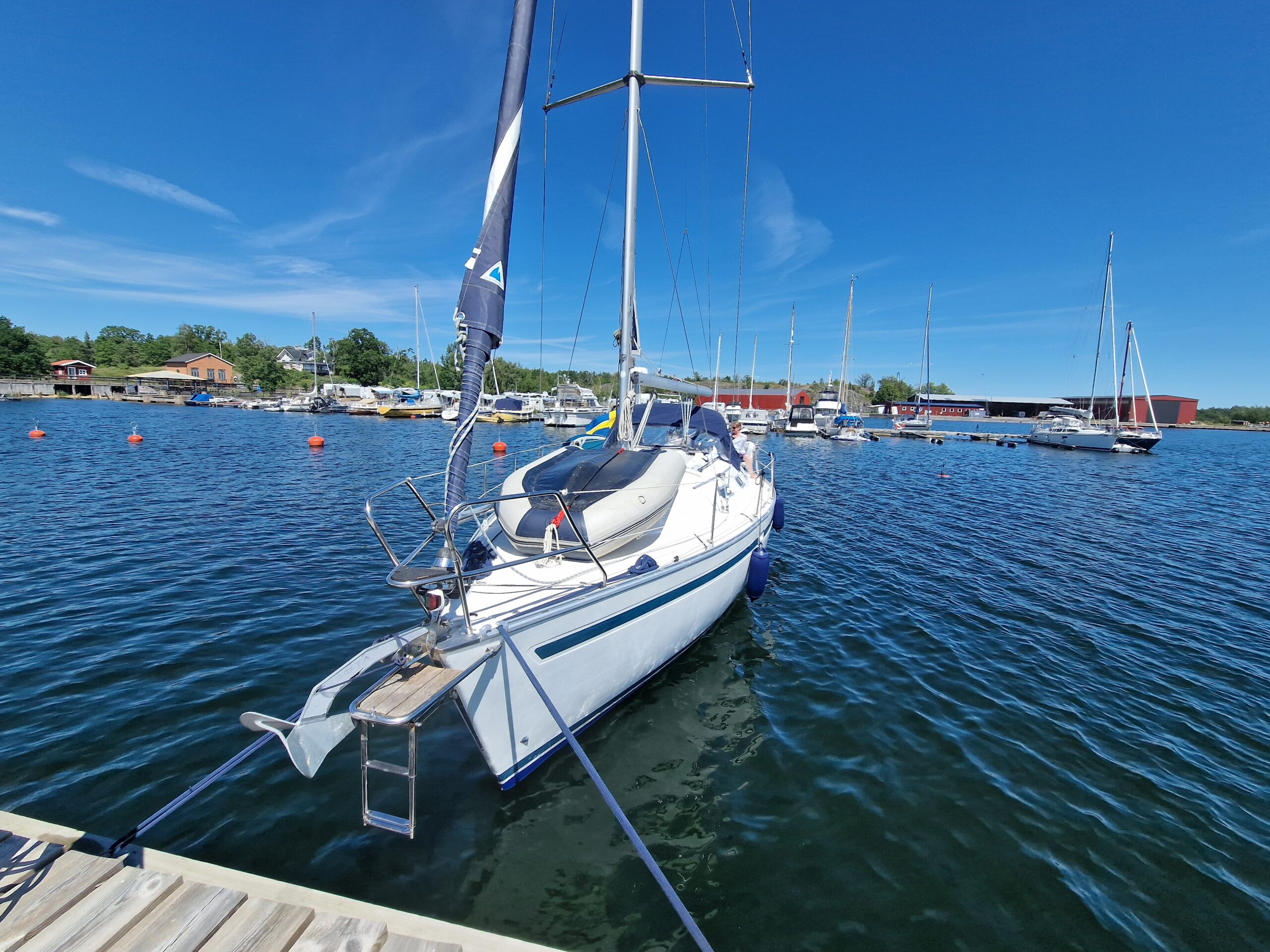 Efter några dagar i Wästerviks Segelsällskaps gästhamn satte vi segel mot Blankaholm. Vi hade fått höra att det fanns möjlighet att låna en mastkran där, med hopp om att kunna klättra upp och laga vindmätaren samt dra ett spinnakerfall – vi hade nämligen bara ett fall till genuan.