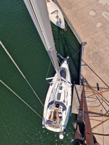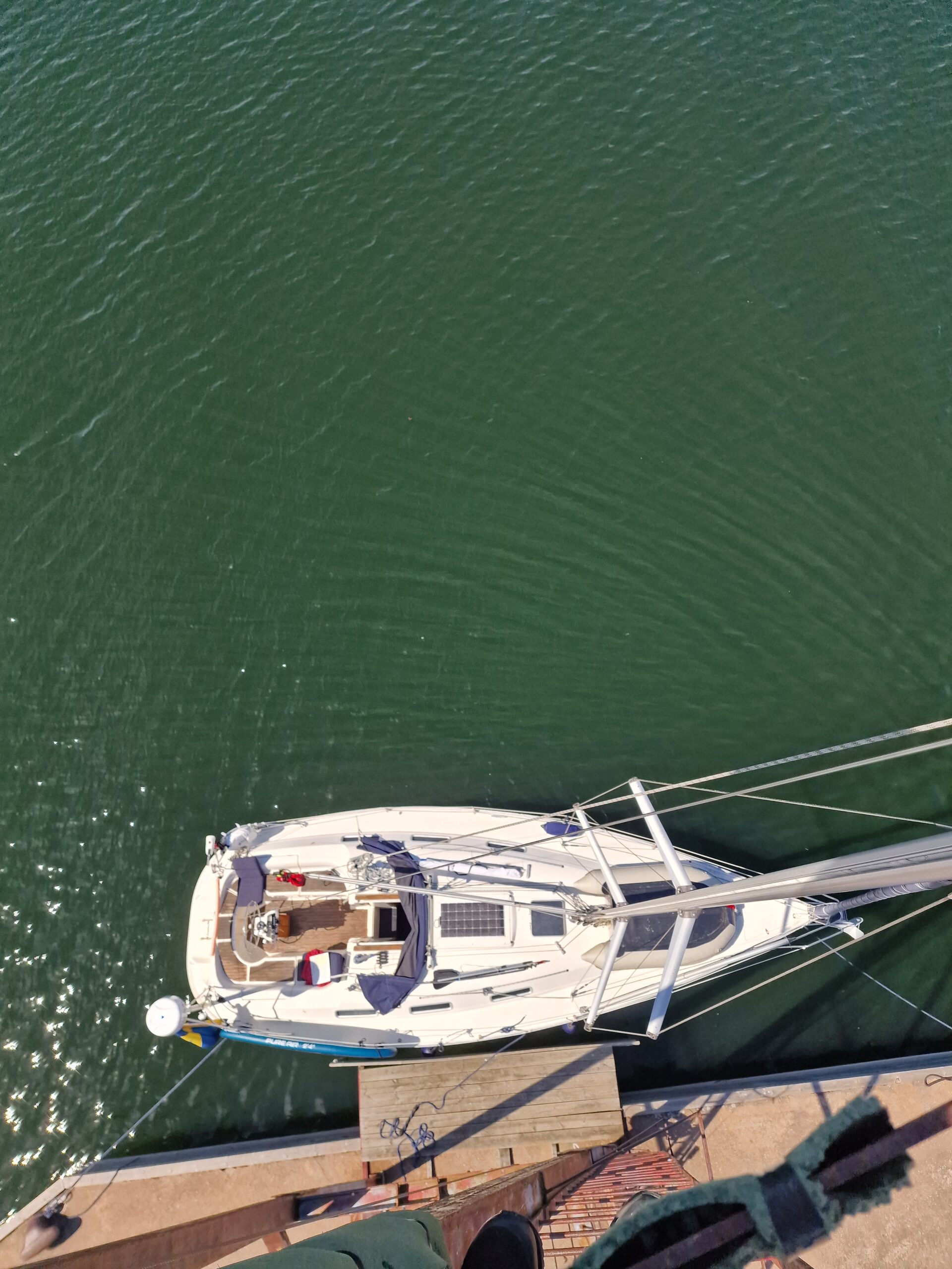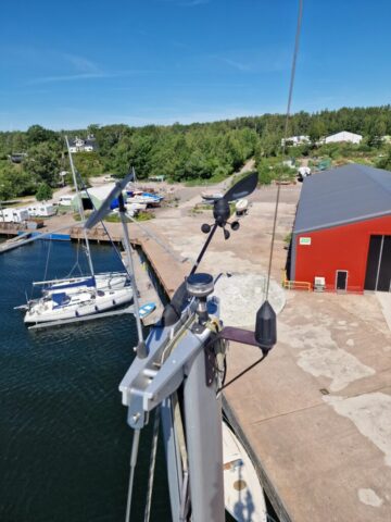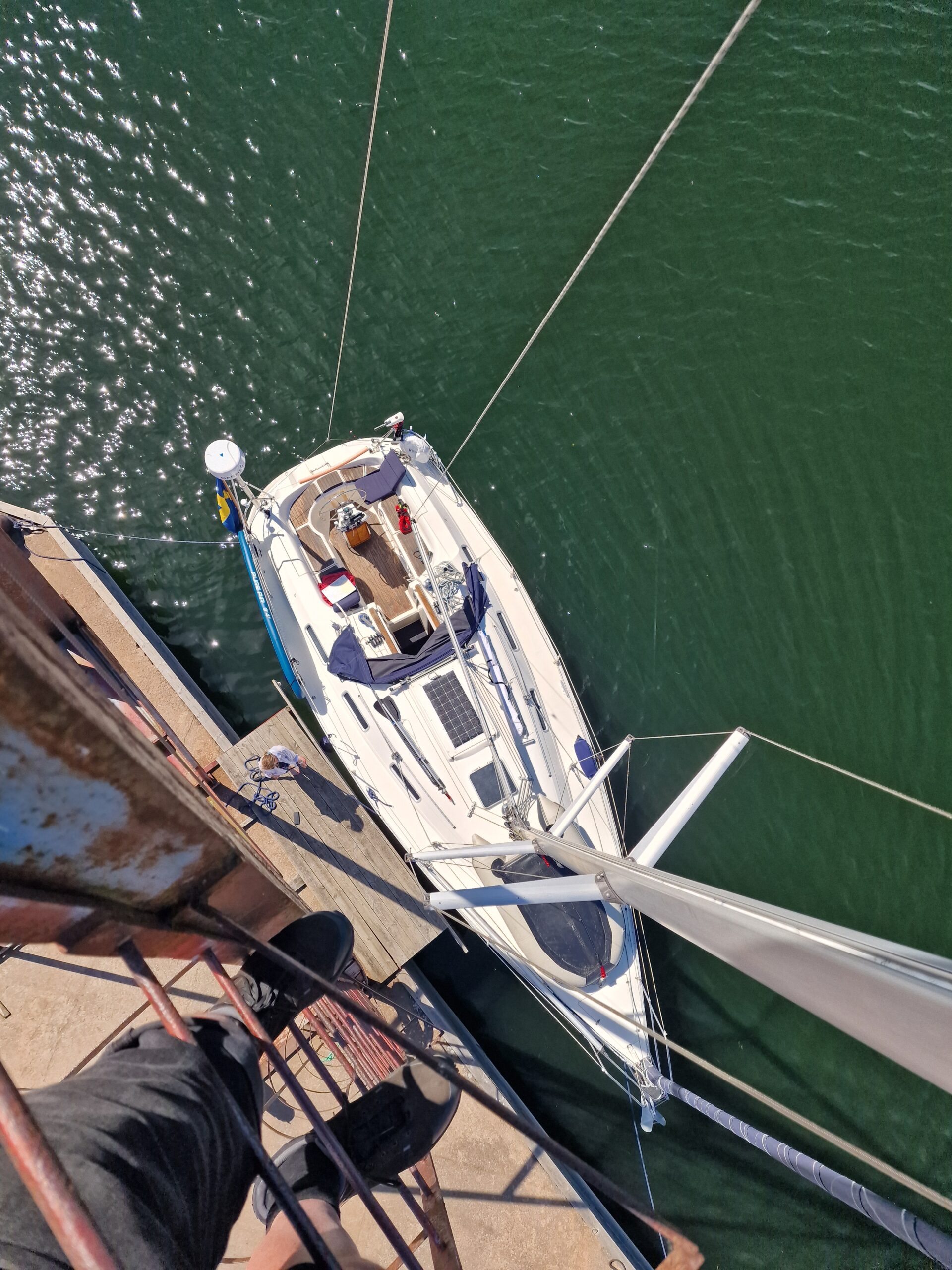 Jag klättrade upp drygt 16 meter i mastkranen och stod där uppe i nästan en timme. Trots ihärdiga försök lyckades jag varken få liv i vindmätaren eller få igenom något nytt fall. När jag till slut tog mig ner igen hade fötterna domnat bort helt. Då stod det klart för oss att mastproblemen fick vänta till hösten, när det ändå var dags att masta av.